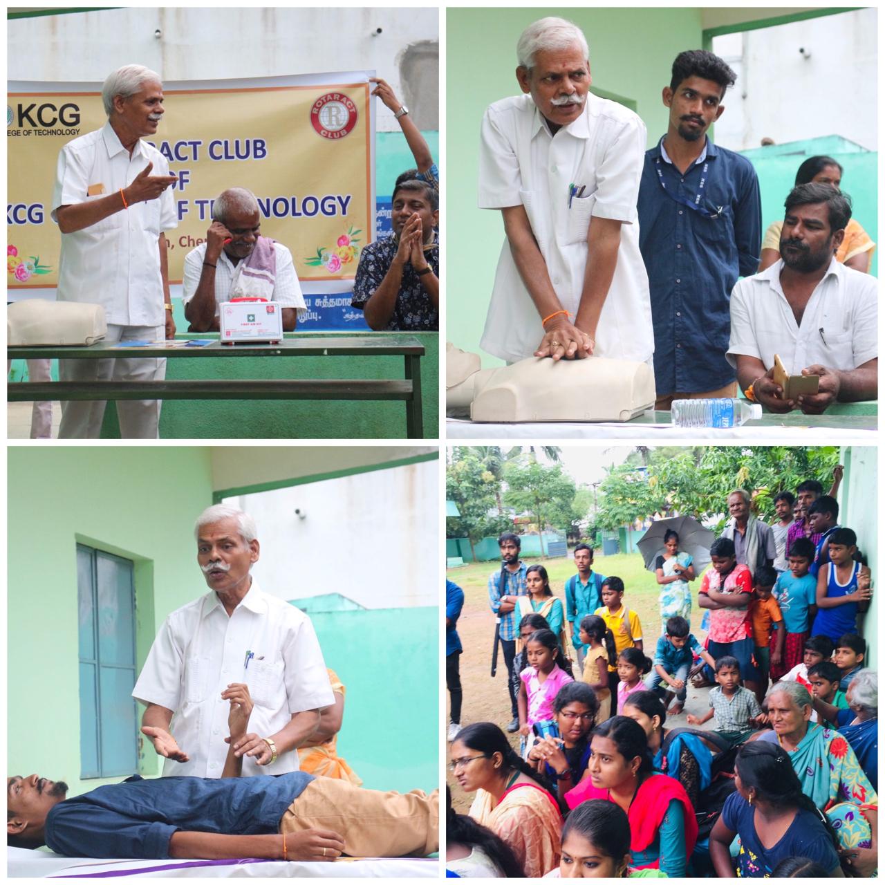 At the helm was Pulavar Manickam, District Secretary, Red Cross Society, Kanchipuram District demonstrating the first aid measures. He shared information that would help in case a road accident, heart attack, snake and other insect bites, electric shock, seizures, fire accident etc. We had about 70 people from the village and 15 rotaract volunteers participate in this informative session. Dr. Praveen Joe, Faculty Advisor of the Rotaract movement, coordinated the event.