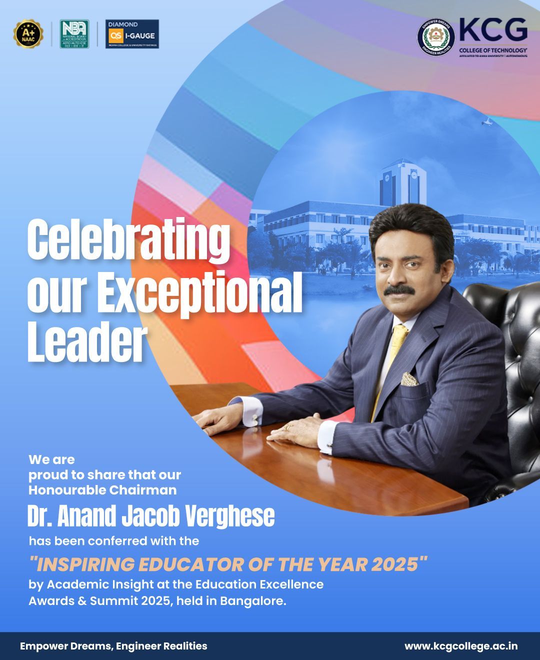 Our Founder Chairman Late Dr. K.C.G. Verghese was a visionary who pioneered high quality technical education in the fields of Engineering, Aviation, Management and Applied Science.