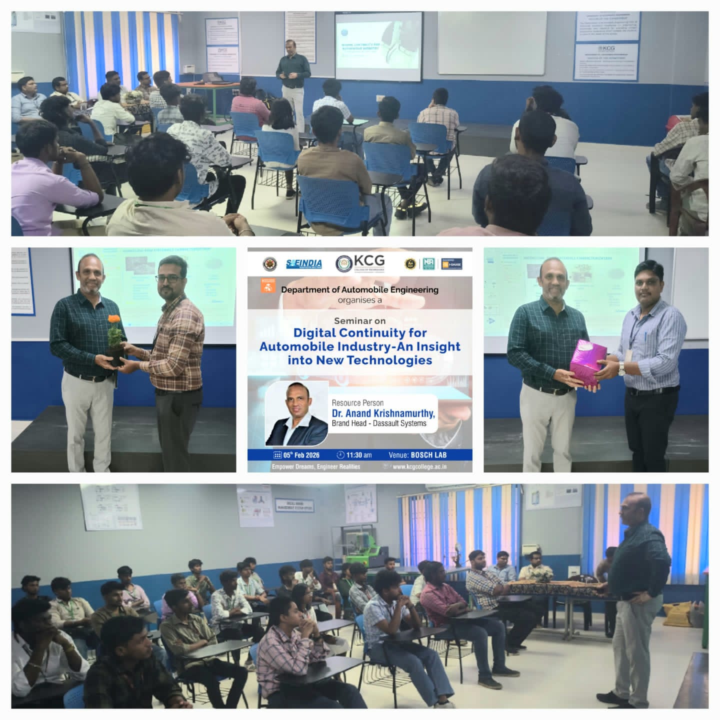 The Department of Automobile Engineering organized a seminar titled “Digital Continuity for the Automobile Industry An Insight into New Technologies.” on 5th February 2026. The session was delivered by Dr. Anand Krishnamurthy, Brand Head, Dassault Systems.