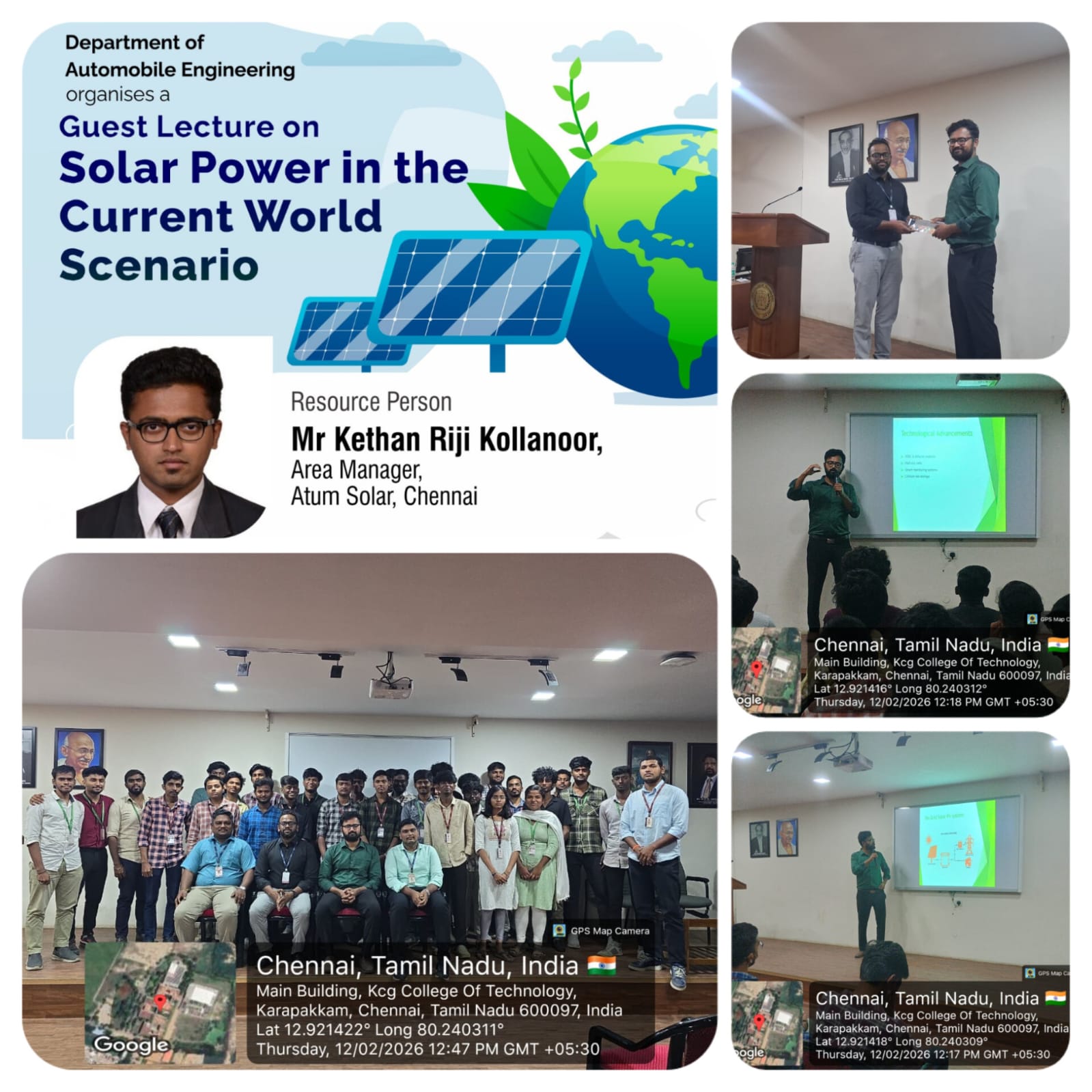 The Department of Automobile Engineering organized a seminar titled “Solar Power in the current world scenario” on 12th February 2026. The session was delivered byMr. KethanRijiKollanur, Area Manager, Atum Solar, Chennai.