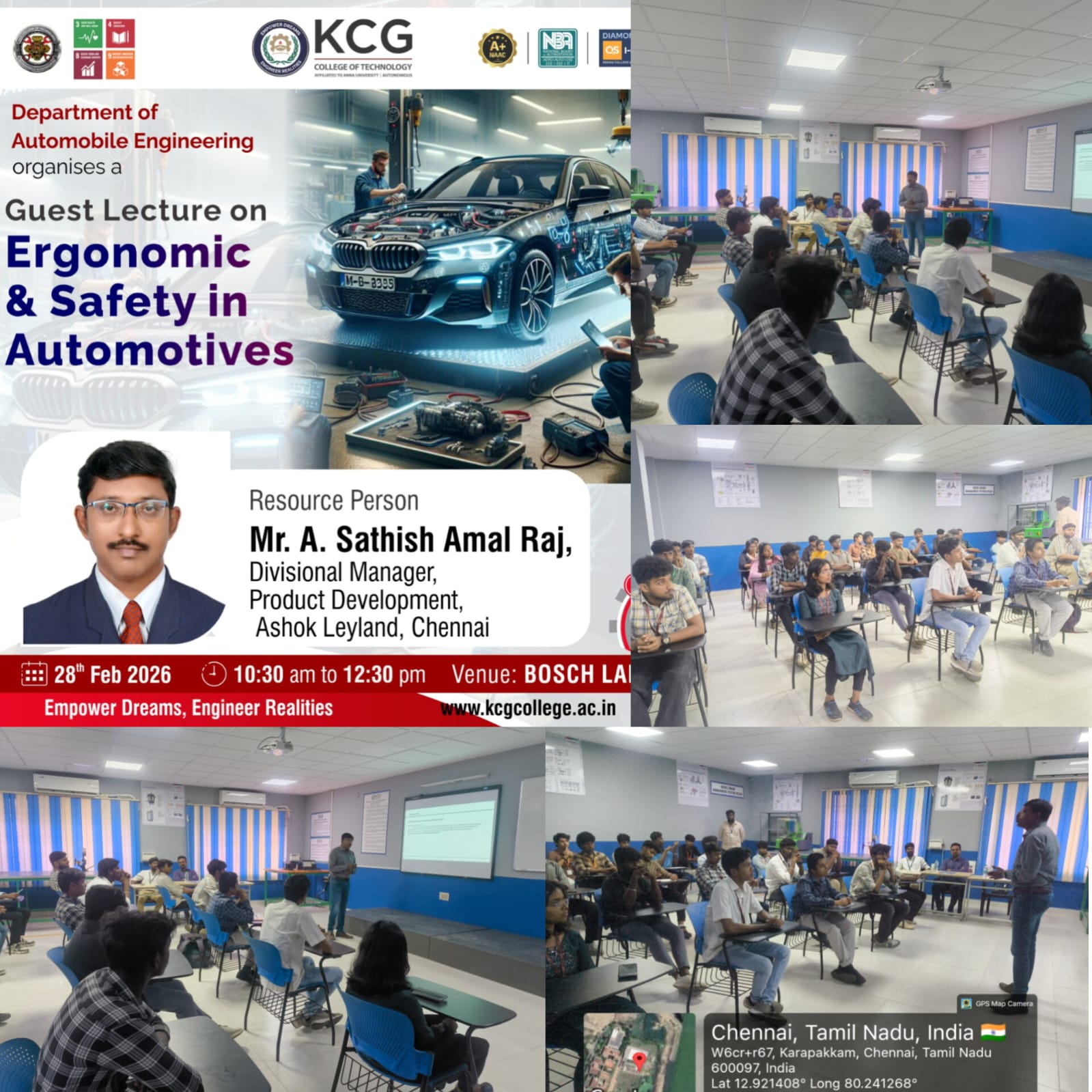 The Department of Automobile Engineering organized a seminar titled “Ergonomic and Safety in Automotives” on 28th February 2026. The session was delivered byMr.A Sathish Amal Raj, Divisional Manager, Product Management, Ashok Leyland, Chennai.