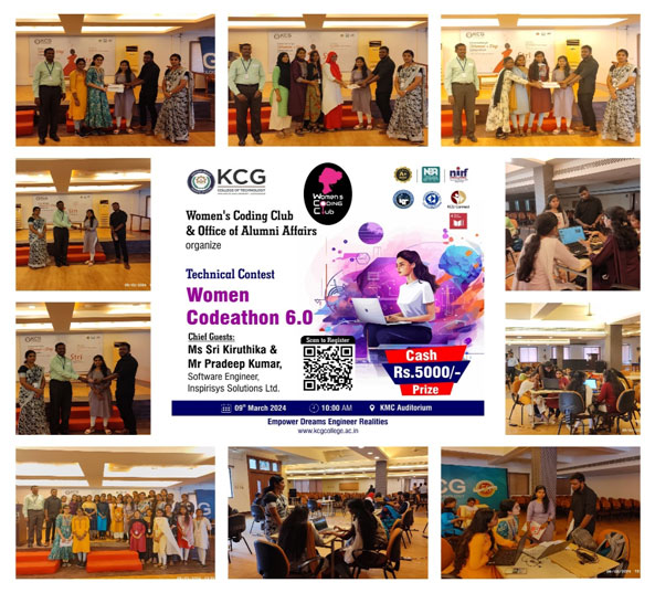 KCG Women’s Coding Club has organized a Hackathon- Women Codeathon 6.O for girl students on 9.3.24 (Saturday). The event started with a formal inauguration by Ms Anju.A, KCG Women’s Club Coordinator. The contest started at 9.00 am, the girl students from various department had registered and participated in the event. Around 60 students had registered and 17 teams (45students) had participated for the Hackathon-. Students were asked to solve different problem statements in different domains. Students were asked to do a presentation and to show working application of their idea. The invited panel members Ms SrikrithigaIT 2021 alumni) and Mr Pradip Kumar (from Inspirisys Solutions Ltd. evaluated the teams for creativity, novelty and presentation of their idea. Judges appreciated the students involvement and creativity and asked them to extend their imagination to next level. Students had shared their experiences about the Codeathon, they were very enthusiastic and excited to solve each challenge.