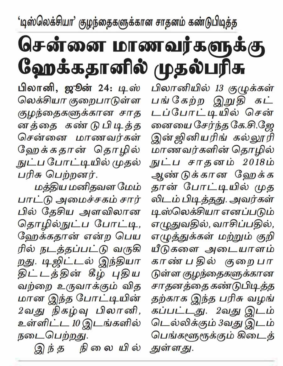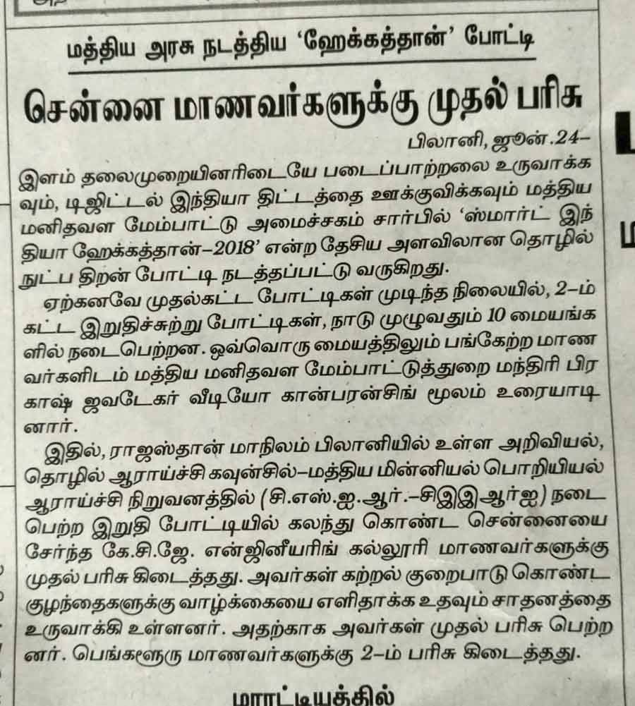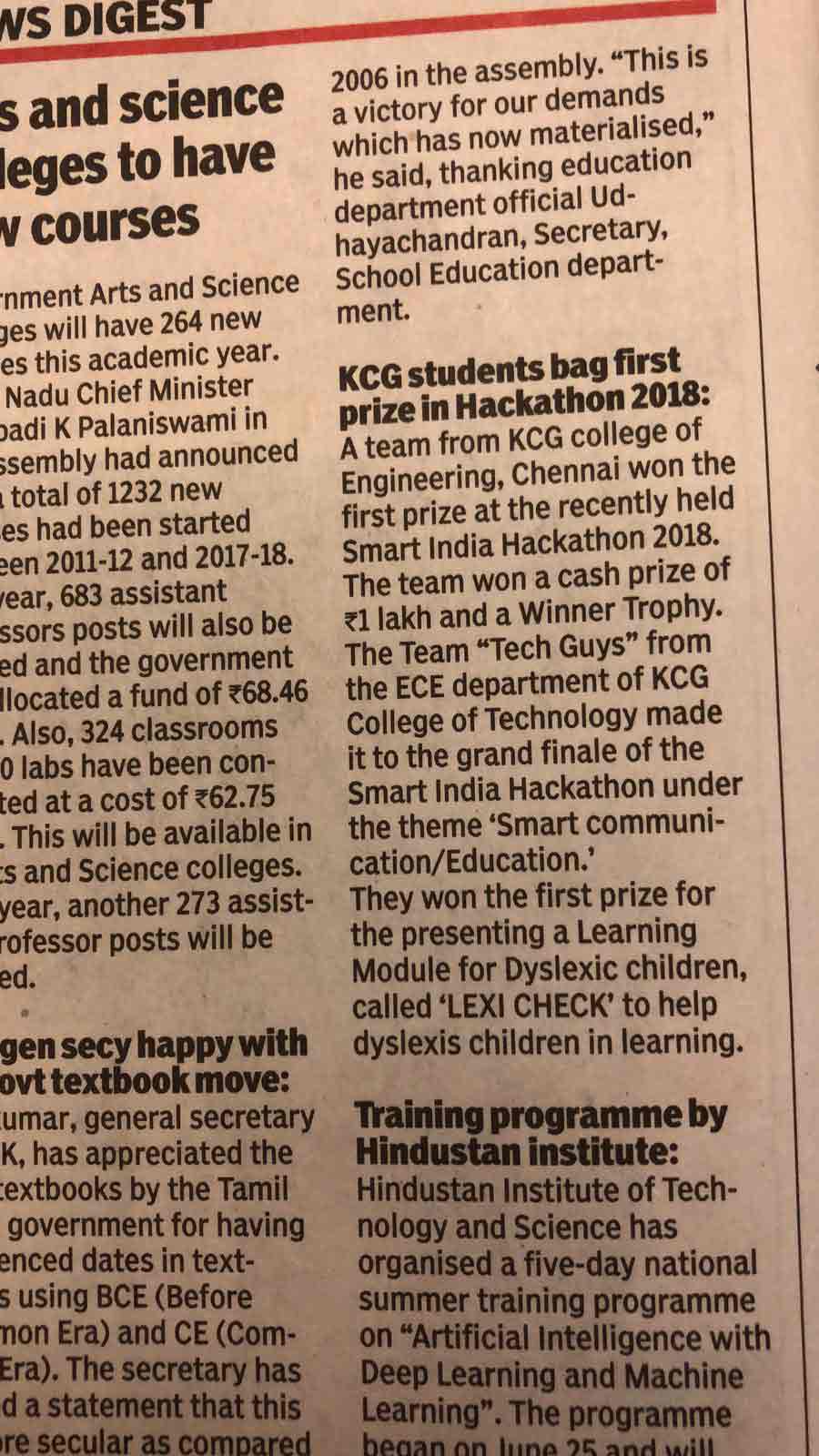 News : KCG Won Smart India Hackathon 2018