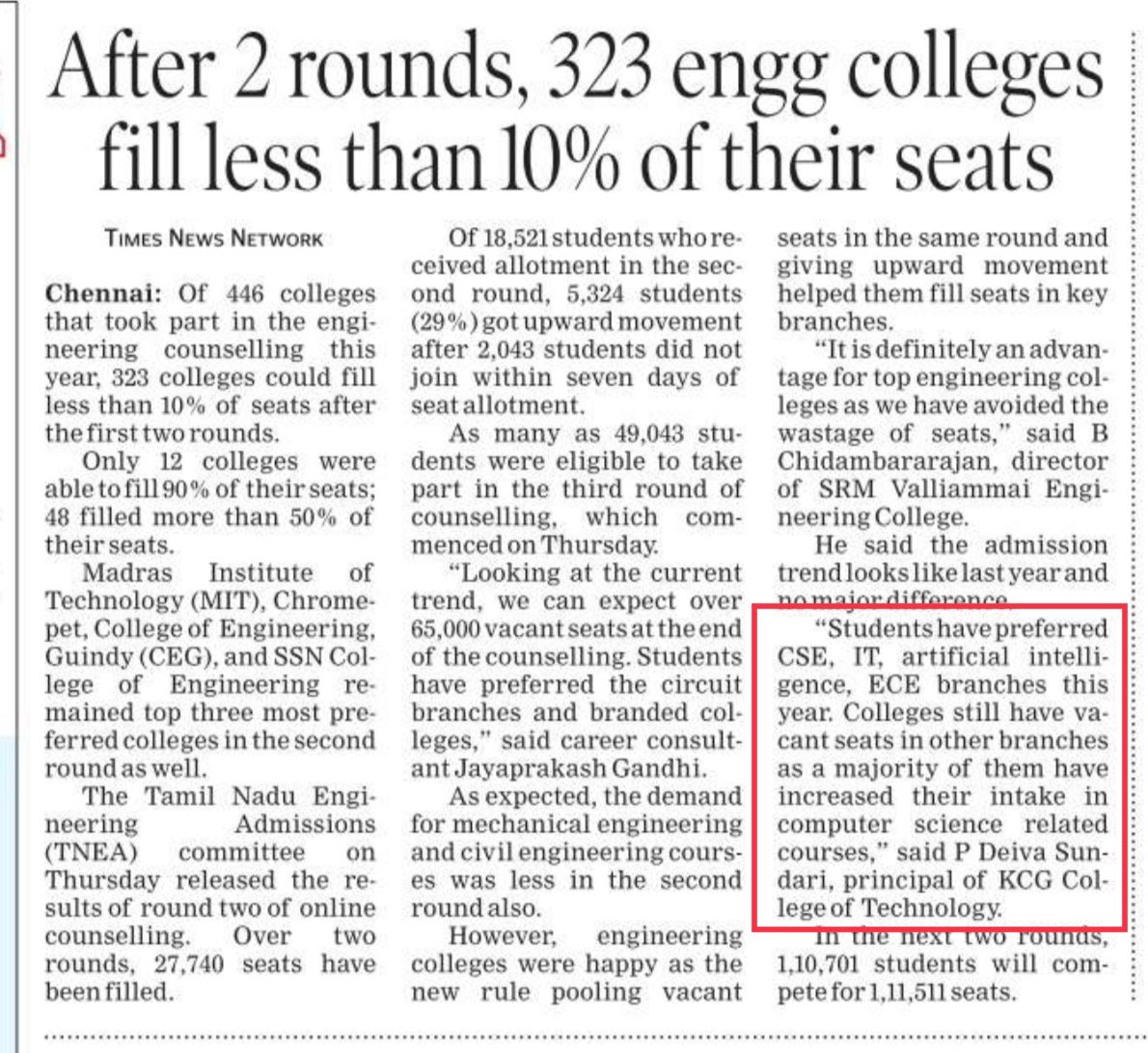 News : After 2 rounds, 323 engg colleges fill less than 10% of their seats
