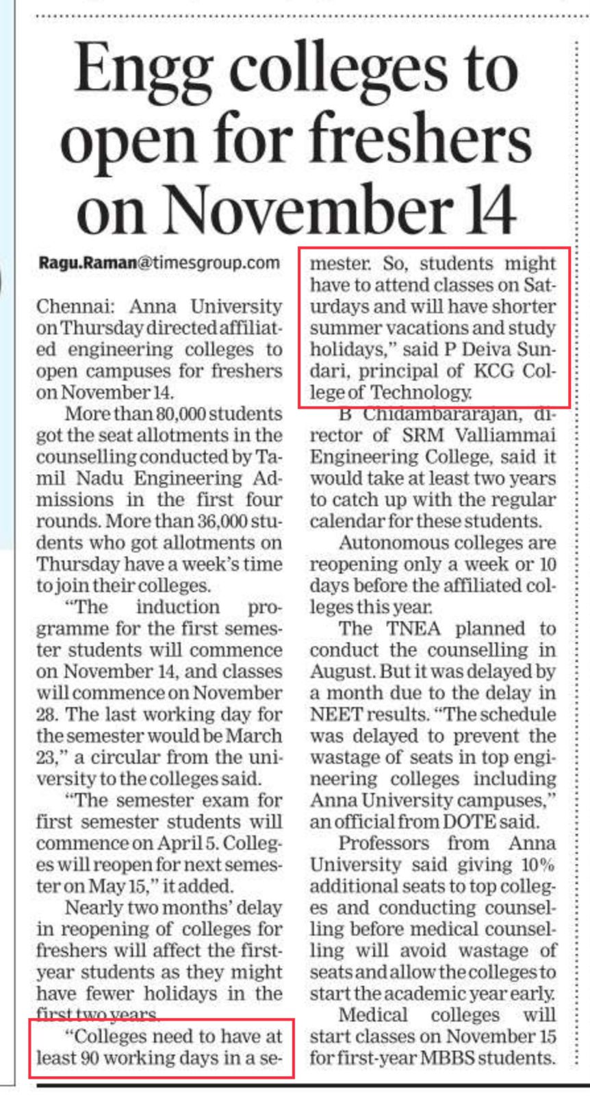 News : Engg colleges to open for freshers on November 14