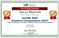 IUCEE Mission NEP 2020 conducted a competition to collect real world examples relevant to each concept in these (physics, mathematics, chemistry, programming, graphics, workshop) courses. The students listed below won the cash awards in May 2021 for the video submission on the above concepts.