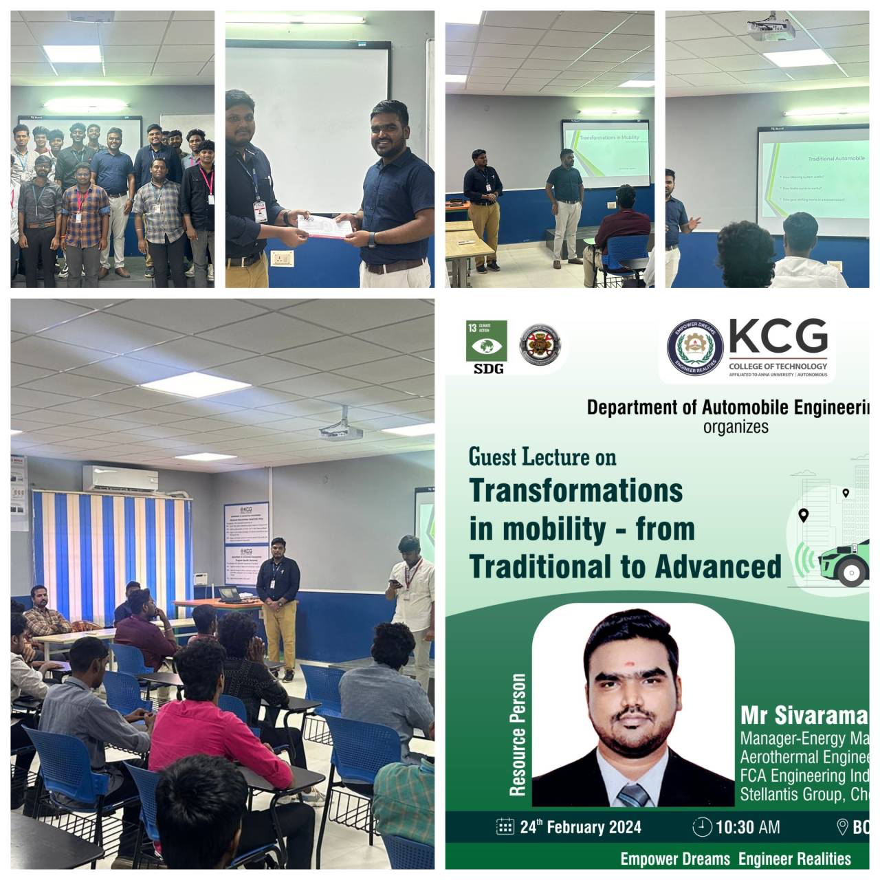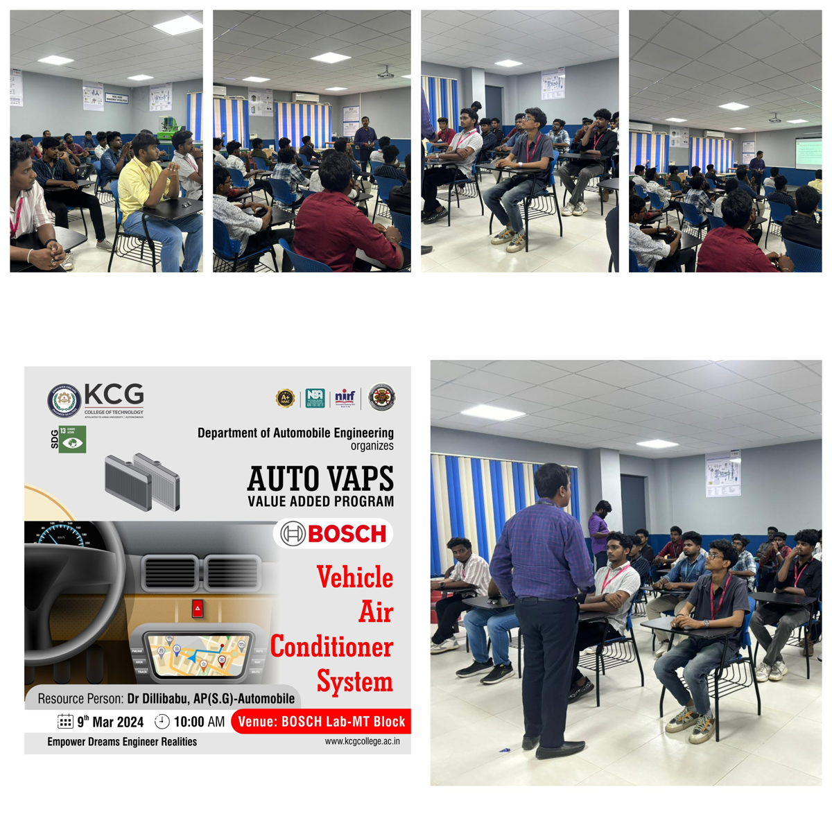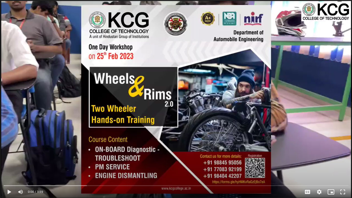The Department of Automobile Engineering at KCG College was started in the year 2018 with a sanctioned intake of 60 students. The department is equipped with highly qualified faculty of proven ability and state-of-the-art laboratories that cater to the needs of the industry. The department further encourages professional activity of the staff and students through SAE INDIA and also provides value added trainings, workshops and seminars to all the students to gain practical exposure in their area of interest.