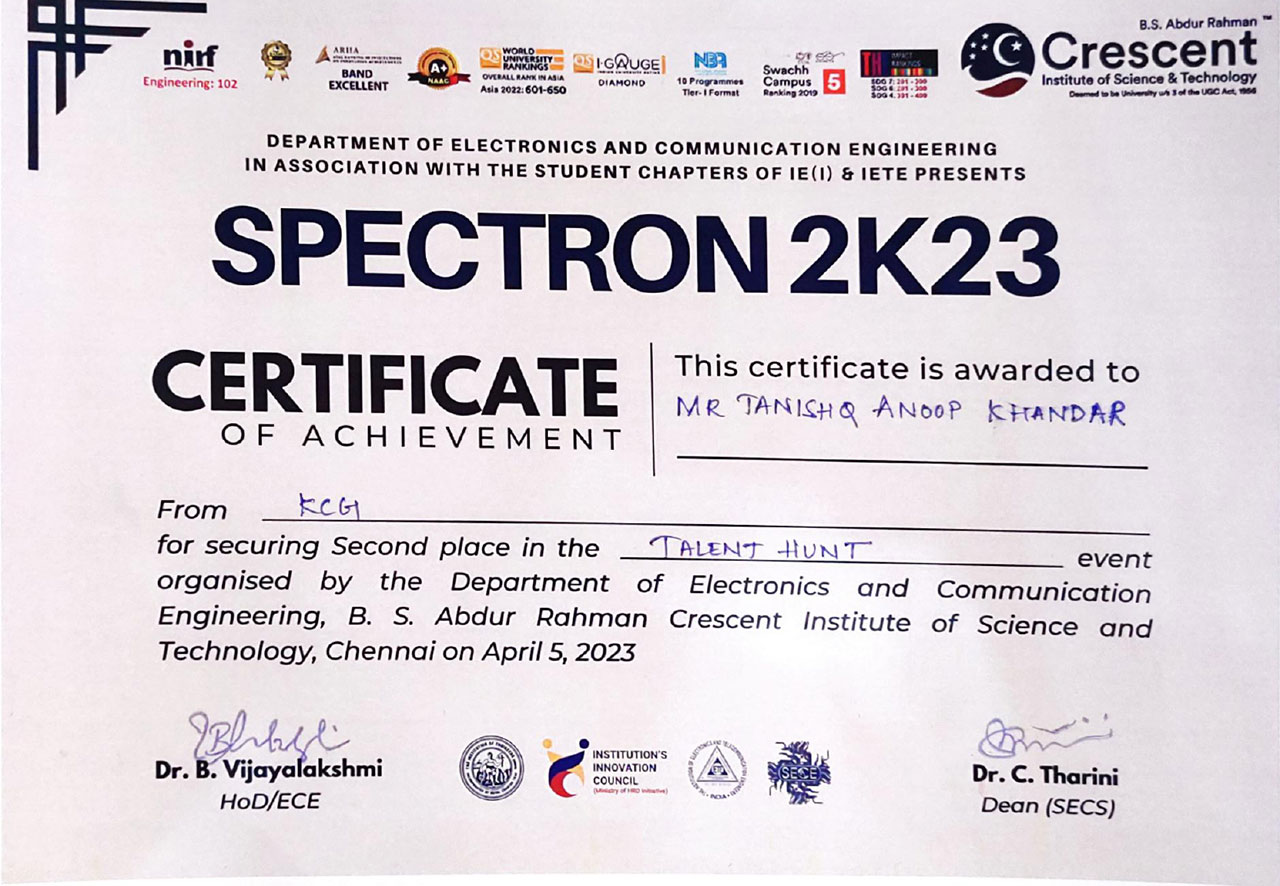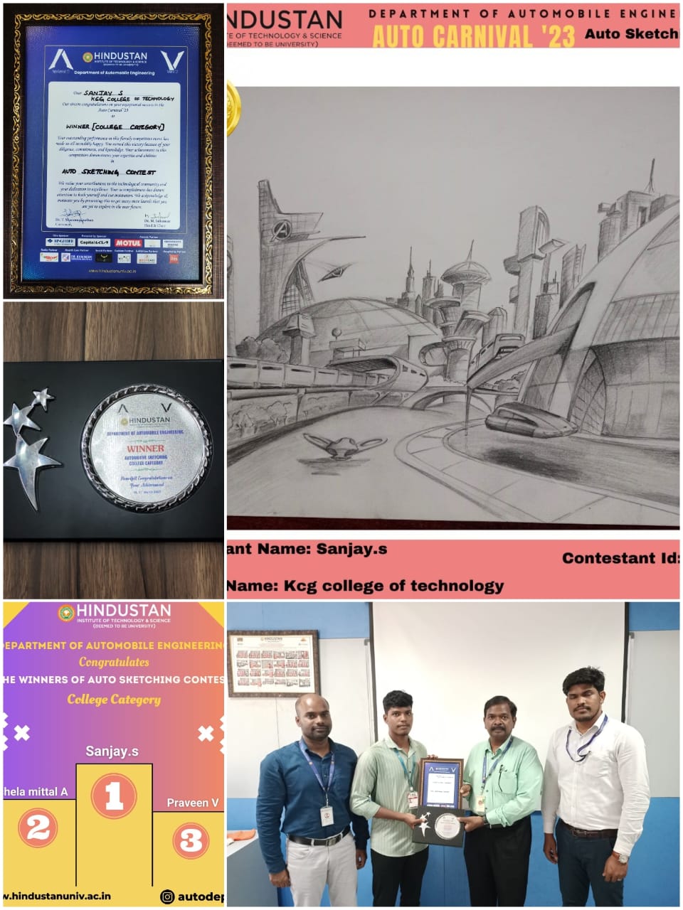 2nd year Automobile Mr. Sanjay S participated Vahanaa 23- Auto Carnival 23 at HITS – Won 1st place in Automotive Sketching contest. Third year Automobile student Tanishq Anoop Khandar has participated and Won 2nd Price & Cash price of Rs.500 in Spectron 2K23 organised by B.S Abdur Rahman Crescent Institute of Science & Technology, Chennai on 5th April 2023.