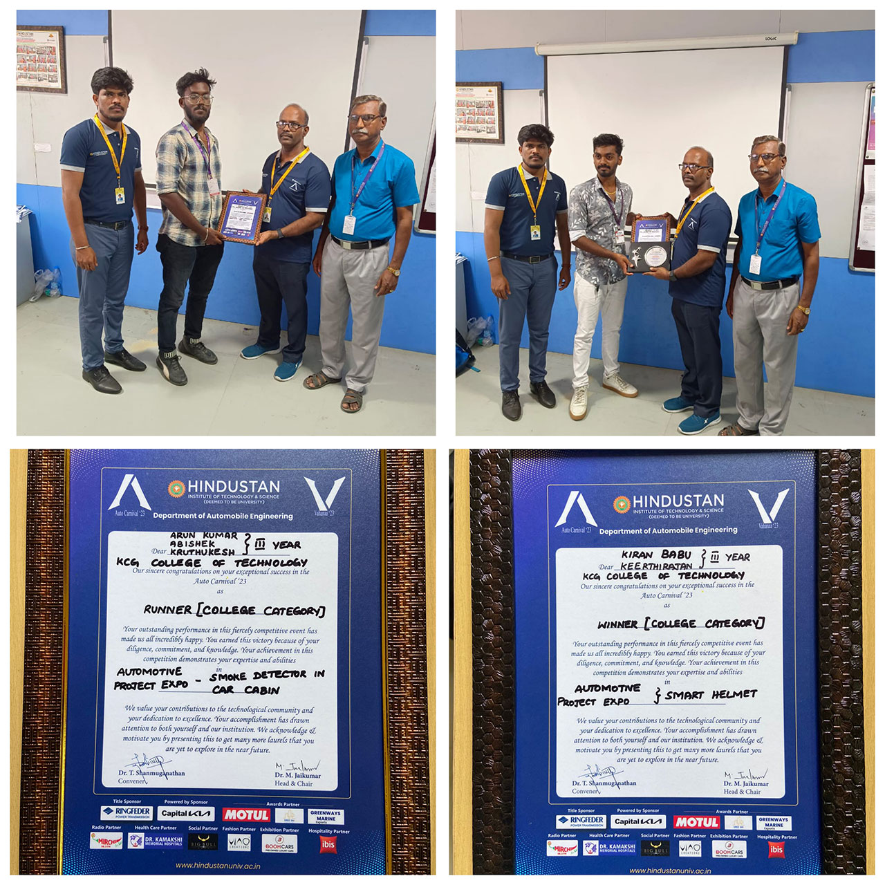 Final year Automobile students Surajnarayanan & Karthikeyan and his team-“KRYOTECH” won the First place in IIT-PALS INNOWOAH2022 on 29th March 2023 for their project “ML Based Onion Cold Storage System” 3rd year Automobile Students participated in “Auto carnival 23- Automotive Project Expo” at Hindustan Institute of Technology & Science on 30th March 2023. Kiranbabu & Keerthirajan-team is selected as the “winner” for their project-“Smart Helmet”. Arunkumar, Abhishek Shaji Thomas & Kruthikesh-team is selected as “Runner” for their project – “Smoke Detector in Car Cabin”