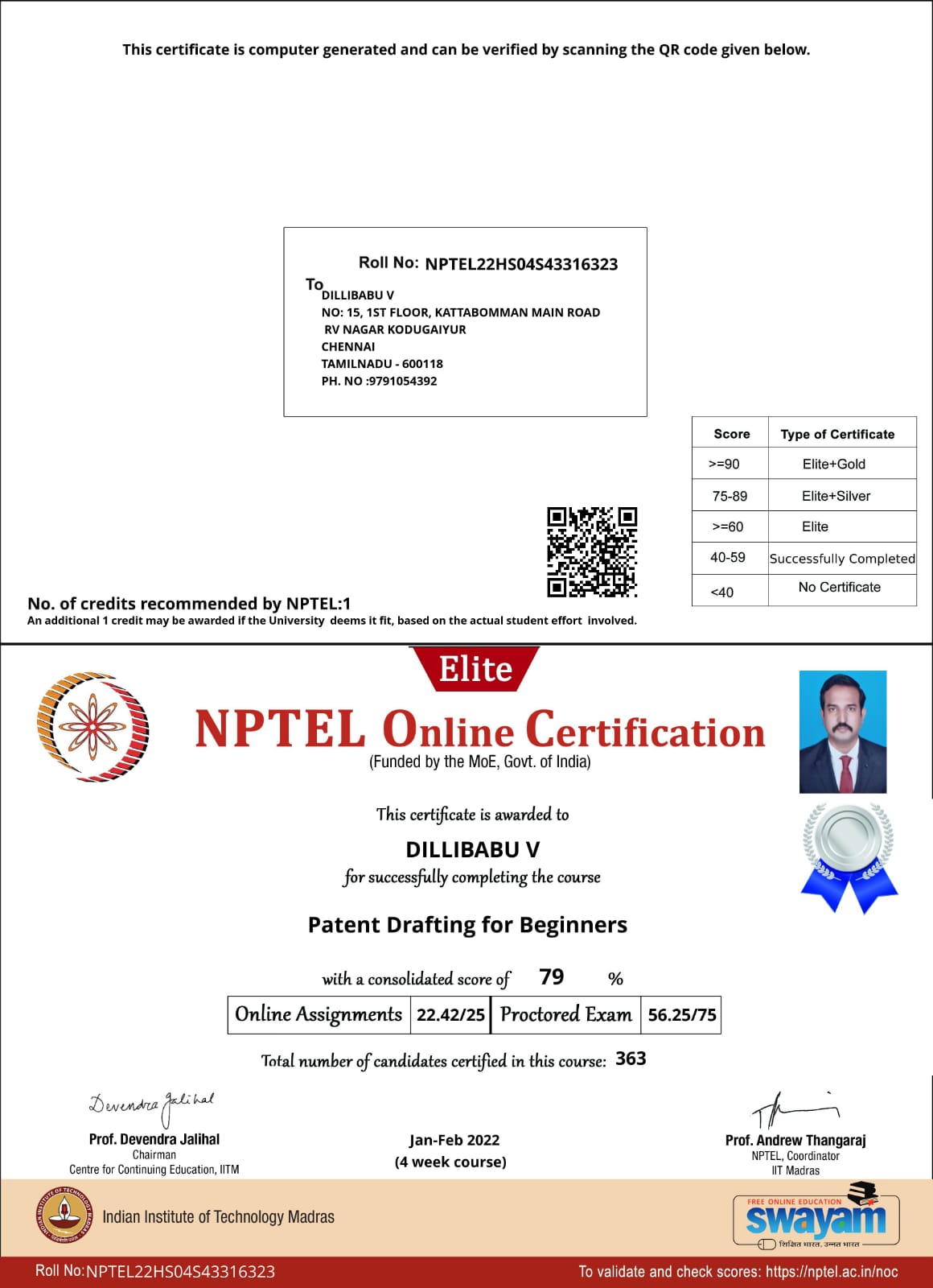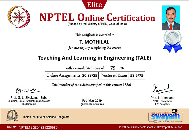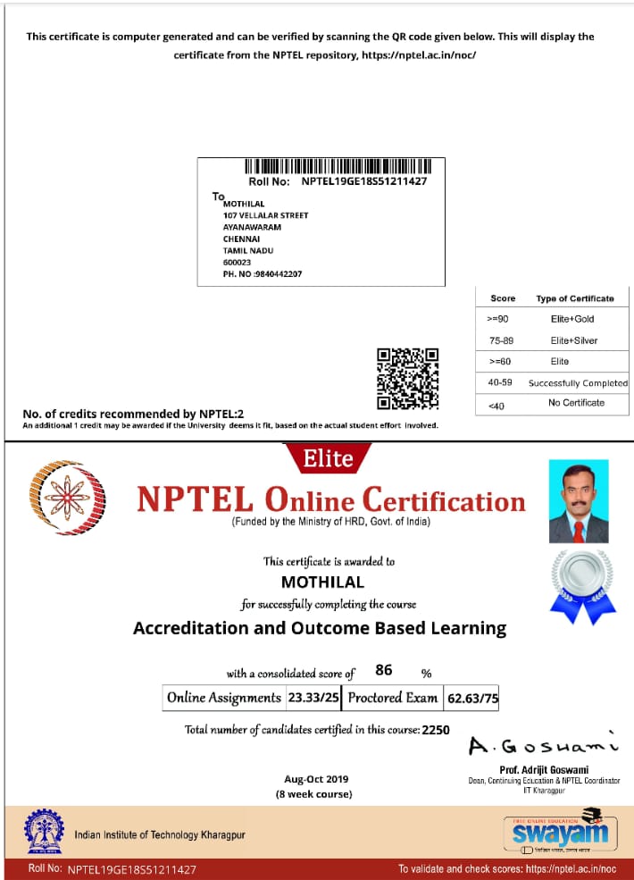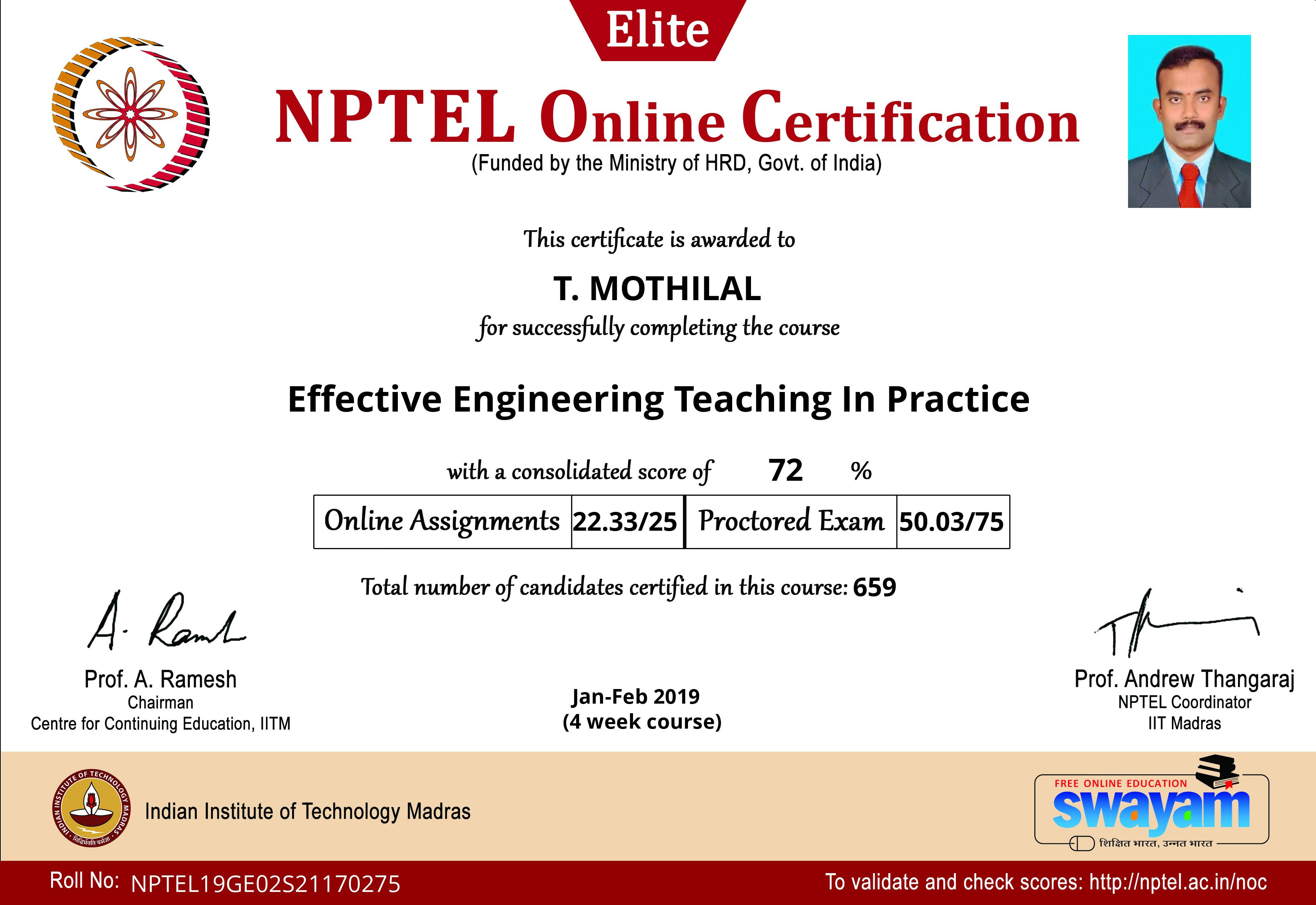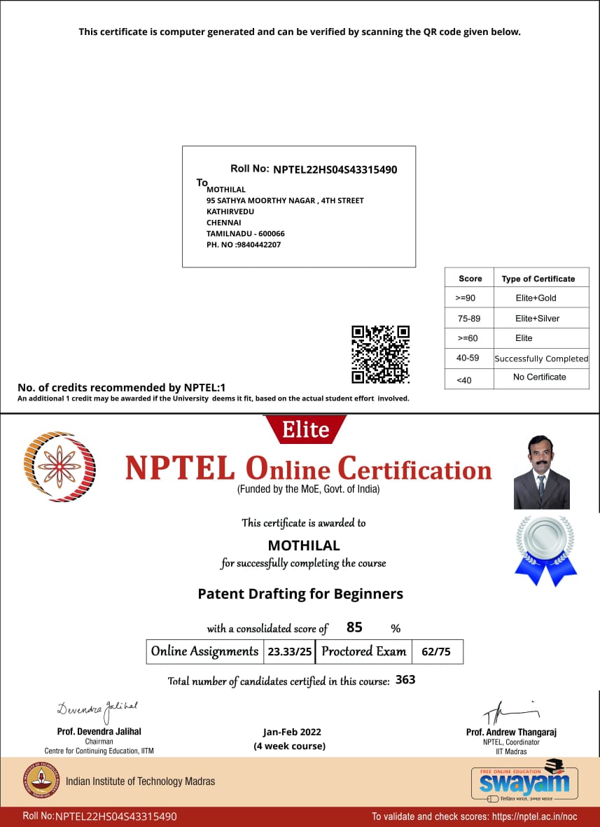 • Dr.T Mothilal got NPTEL Online Certification – (Gold ) category certificate – Managing Intellectual Property In Universities (July to Aug 2023)- ( marks secured -93 ) National level Toppers in the course