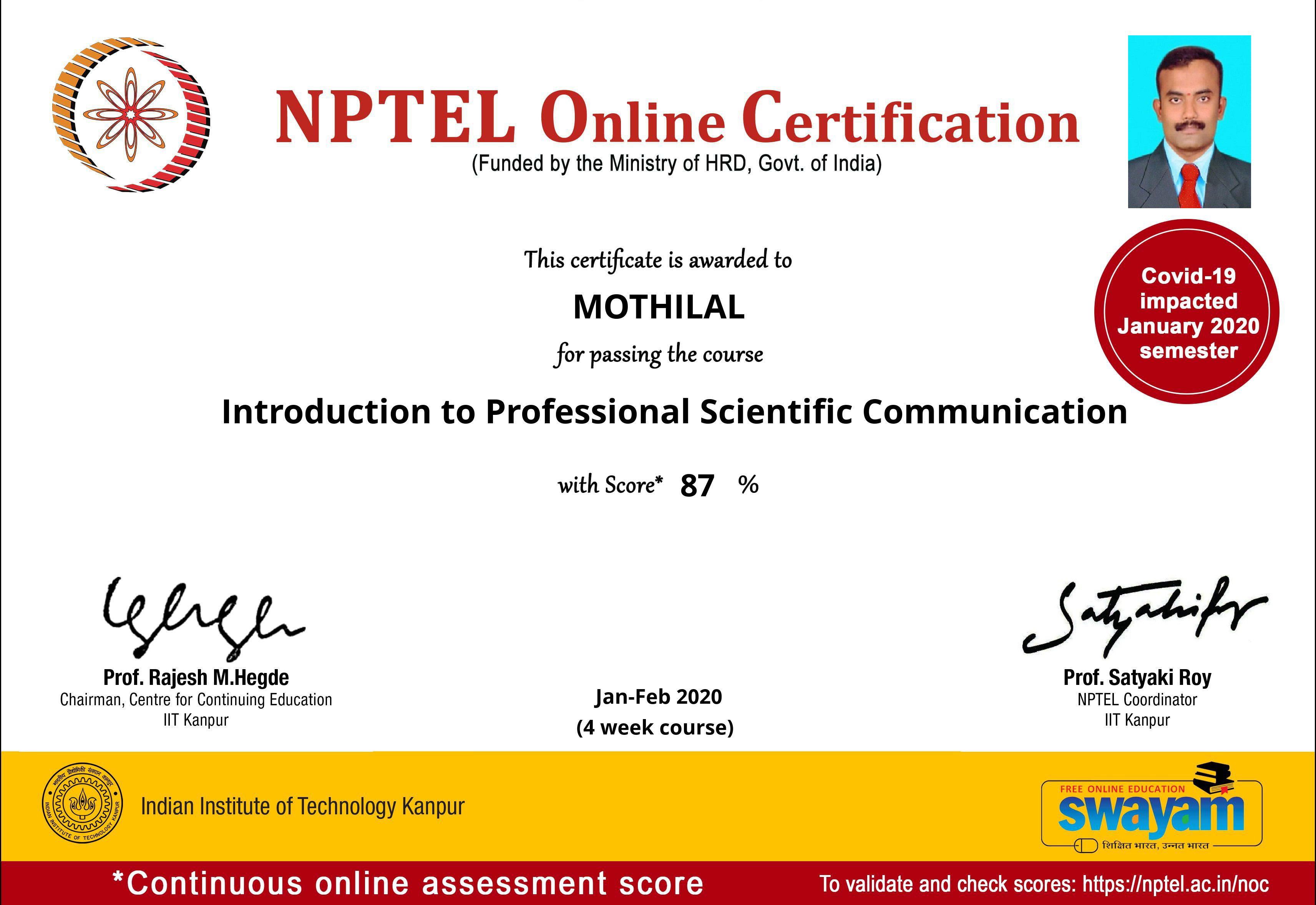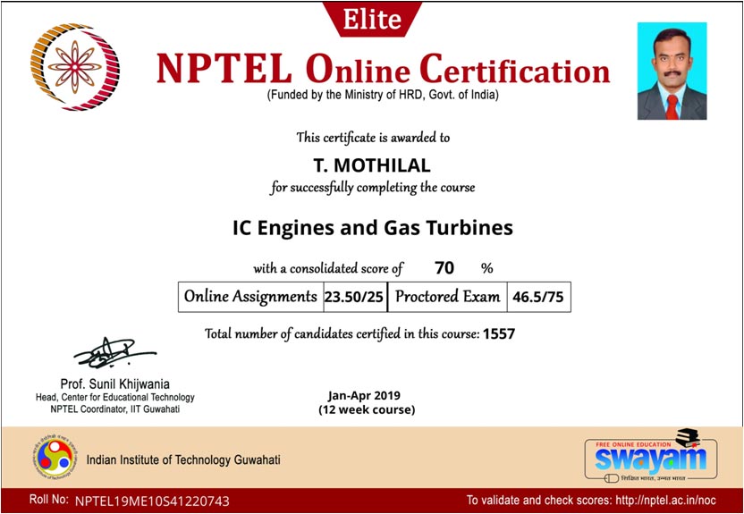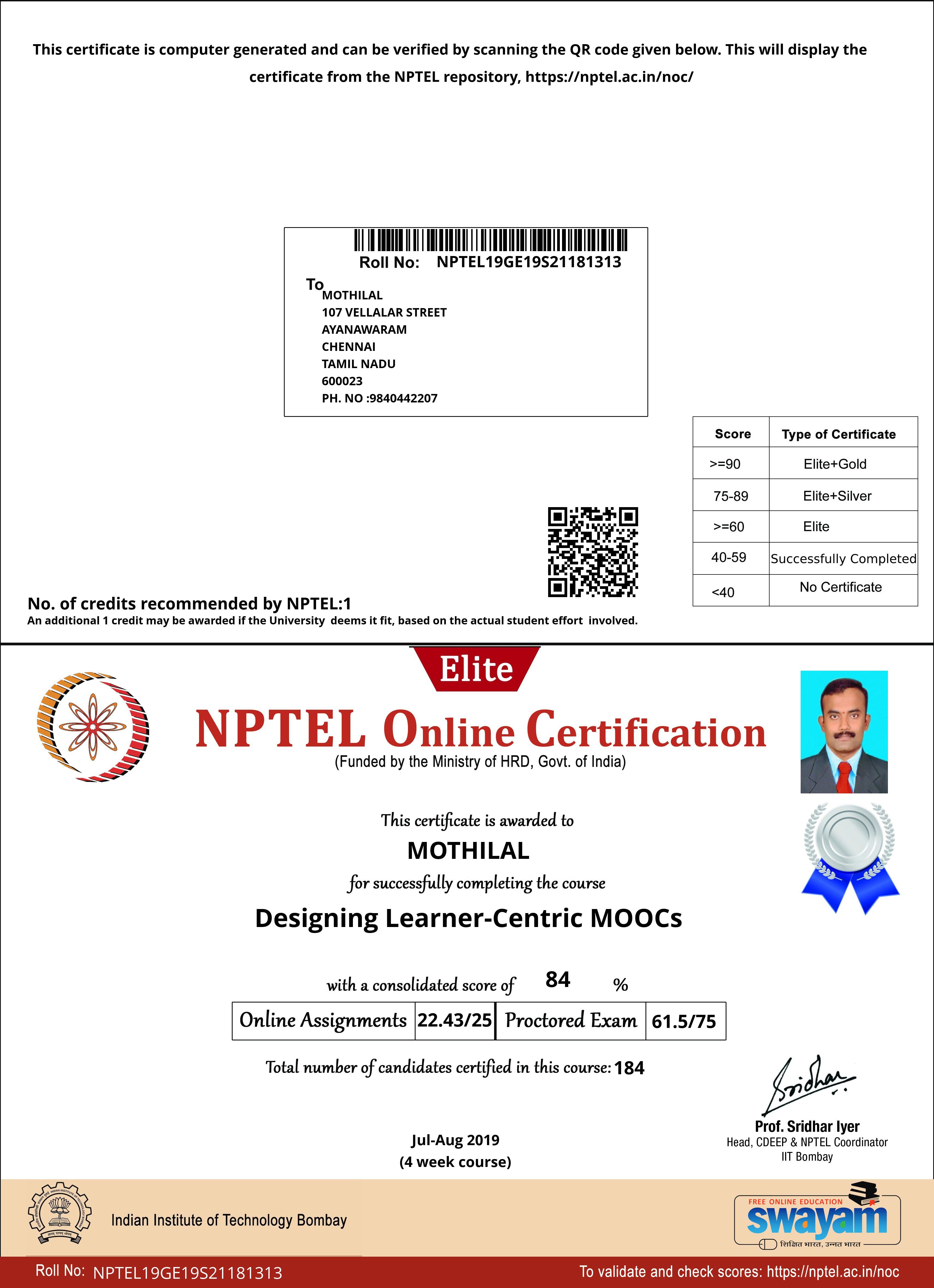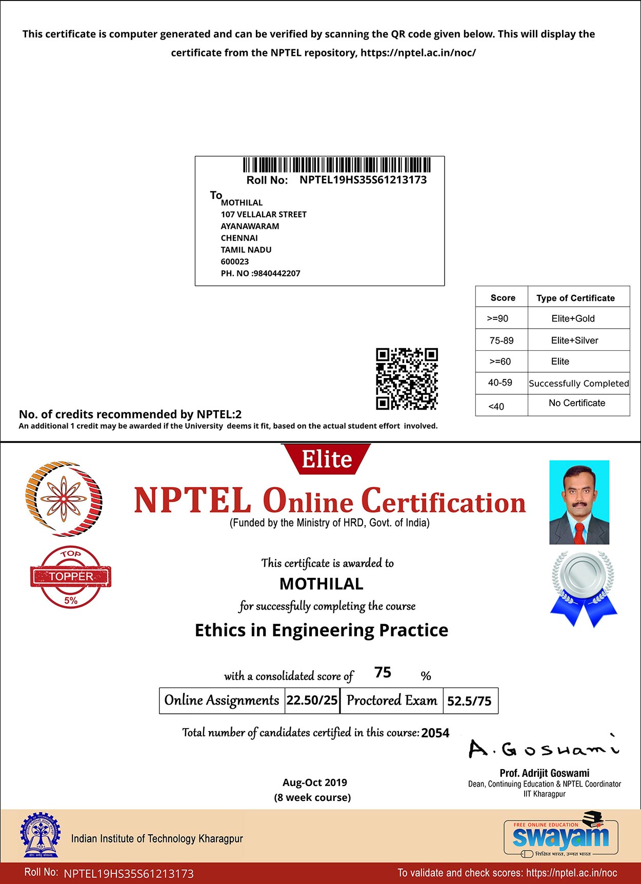 • Dr.T Mothilal got NPTEL Online Certification – (Gold ) category certificate – Managing Intellectual Property In Universities (July to Aug 2023)- ( marks secured -93 ) National level Toppers in the course