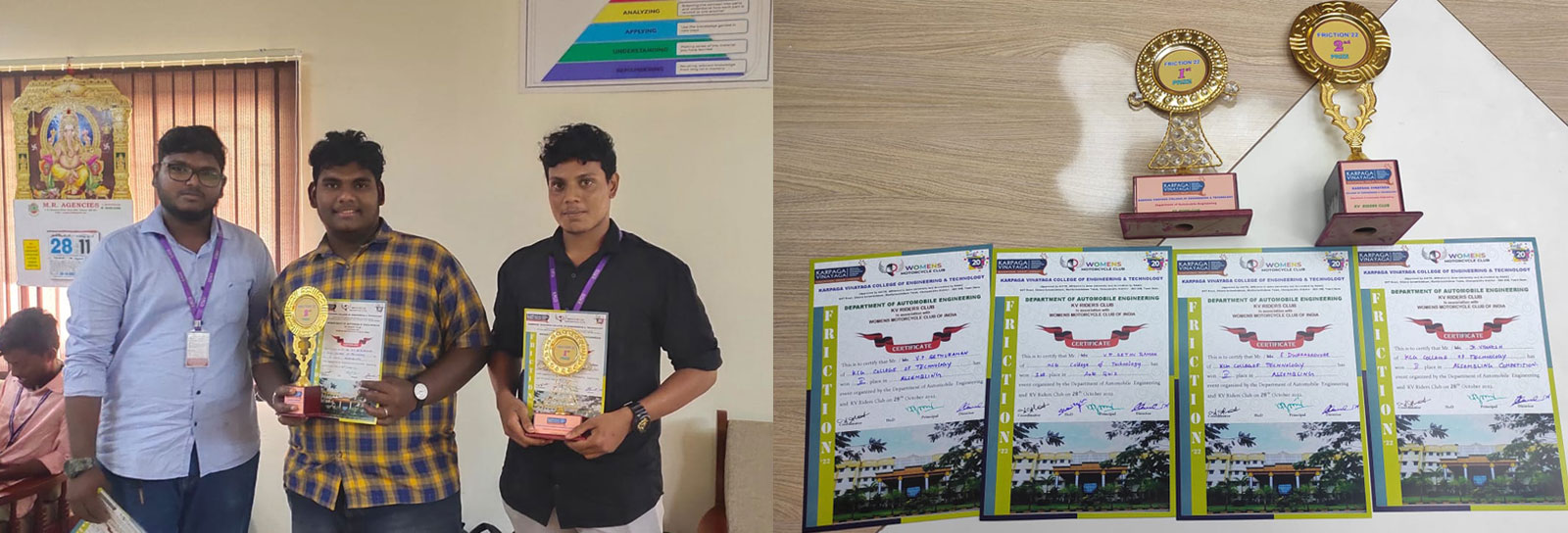 Final year Automobile students Surajnarayanan & Karthikeyan and his team-“KRYOTECH” won the First place in IIT-PALS INNOWOAH2022 on 29th March 2023 for their project “ML Based Onion Cold Storage System” 3rd year Automobile Students participated in “Auto carnival 23- Automotive Project Expo” at Hindustan Institute of Technology & Science on 30th March 2023. Kiranbabu & Keerthirajan-team is selected as the “winner” for their project-“Smart Helmet”. Arunkumar, Abhishek Shaji Thomas & Kruthikesh-team is selected as “Runner” for their project – “Smoke Detector in Car Cabin”