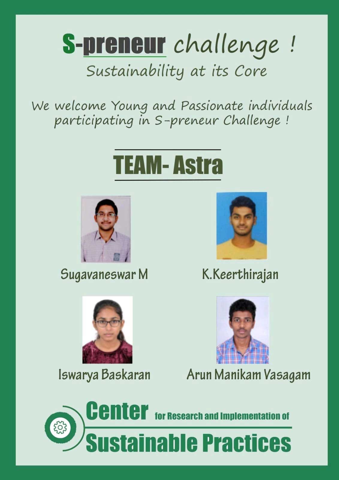 • Keerthi Rajan of Automobile IInd Year and his team named ASTRA has been selected as one of the top 5 teams in S-Preneur Challenge organised by Center for Research and Implementation of Sustainable Practices for their idea of portable solar cooker. >> Read More