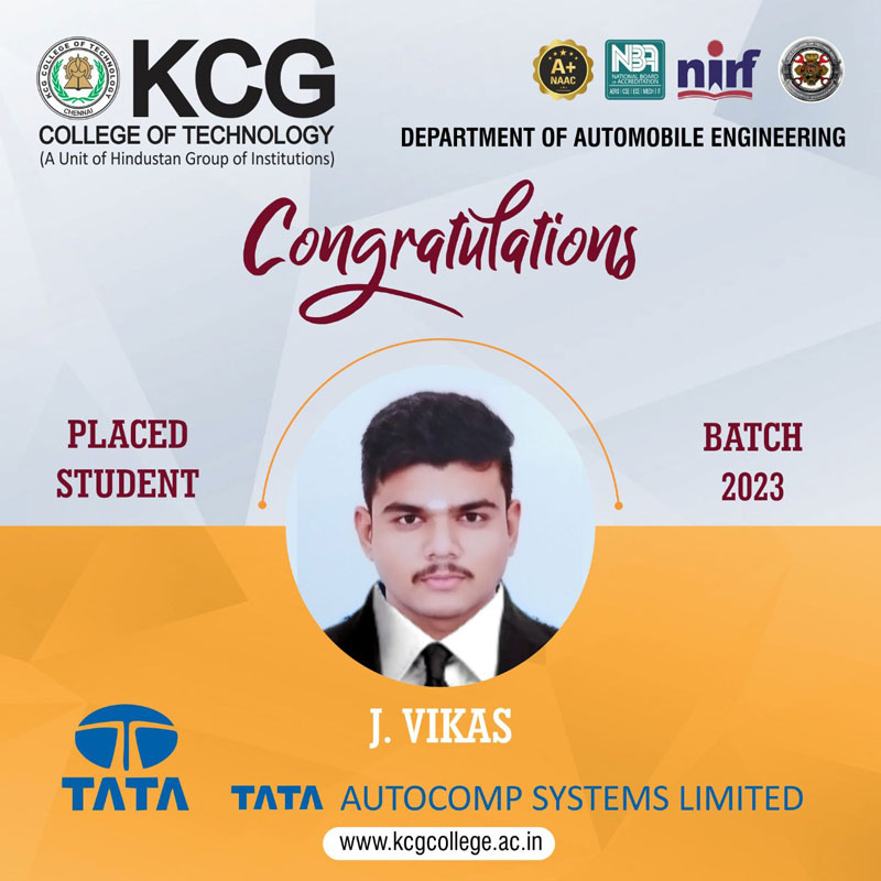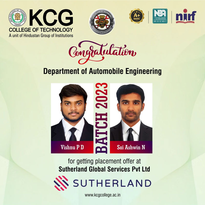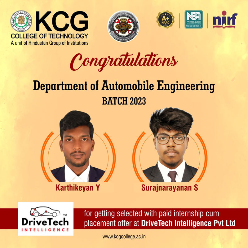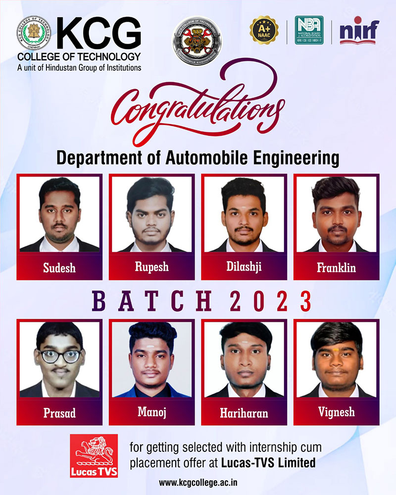 The Department of Automobile Engineering at KCG College was started in the year 2018 with a sanctioned intake of 60 students. The department is equipped with highly qualified faculty of proven ability and state-of-the-art laboratories that cater to the needs of the industry. The department further encourages professional activity of the staff and students through SAE INDIA and also provides value added trainings, workshops and seminars to all the students to gain practical exposure in their area of interest.