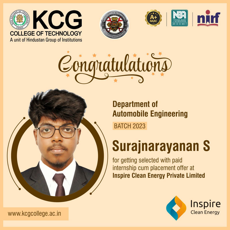 • Third year Automobile student Suraj Narayanan (Team Beyond) has secured 2nd place in IIT-PALS Event under the theme “sustainability” and awarded with a cash prize of Rs.10,000-/.
