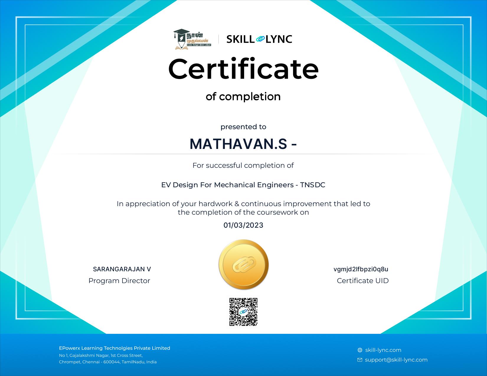 • Second year Automobile student Narayanan has successfully completed the 4 week NPTEL online course ” Electric Vehicles-part-1″