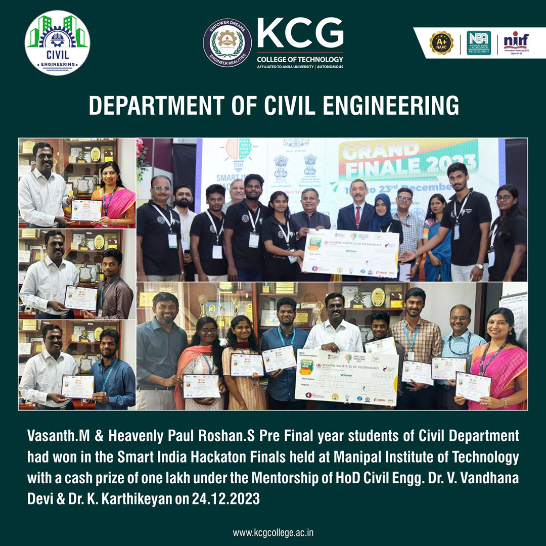 Vasanth.M and Heavenly Paul Roshan.S Pre Final year students of Civil Department had won in the Smart India Hackathon Finals held at Manipal Institute of Technology with a cash prize of One lakh under the Mentorship of HoD Civil Engg. Dr. V. Vandhana Devi and Dr. K. Karthikeyan on 24.12.2023