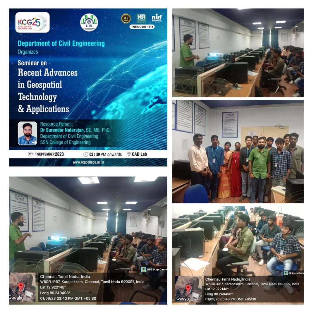 | The Department of Civil Engineering organized Seminar on “Recent Advances in Geospatial Technology and Applications” on 01.09.2023. Resource Person: Dr. Surender Natarajan Department of Civil Engineering, SSN College of Engineering |