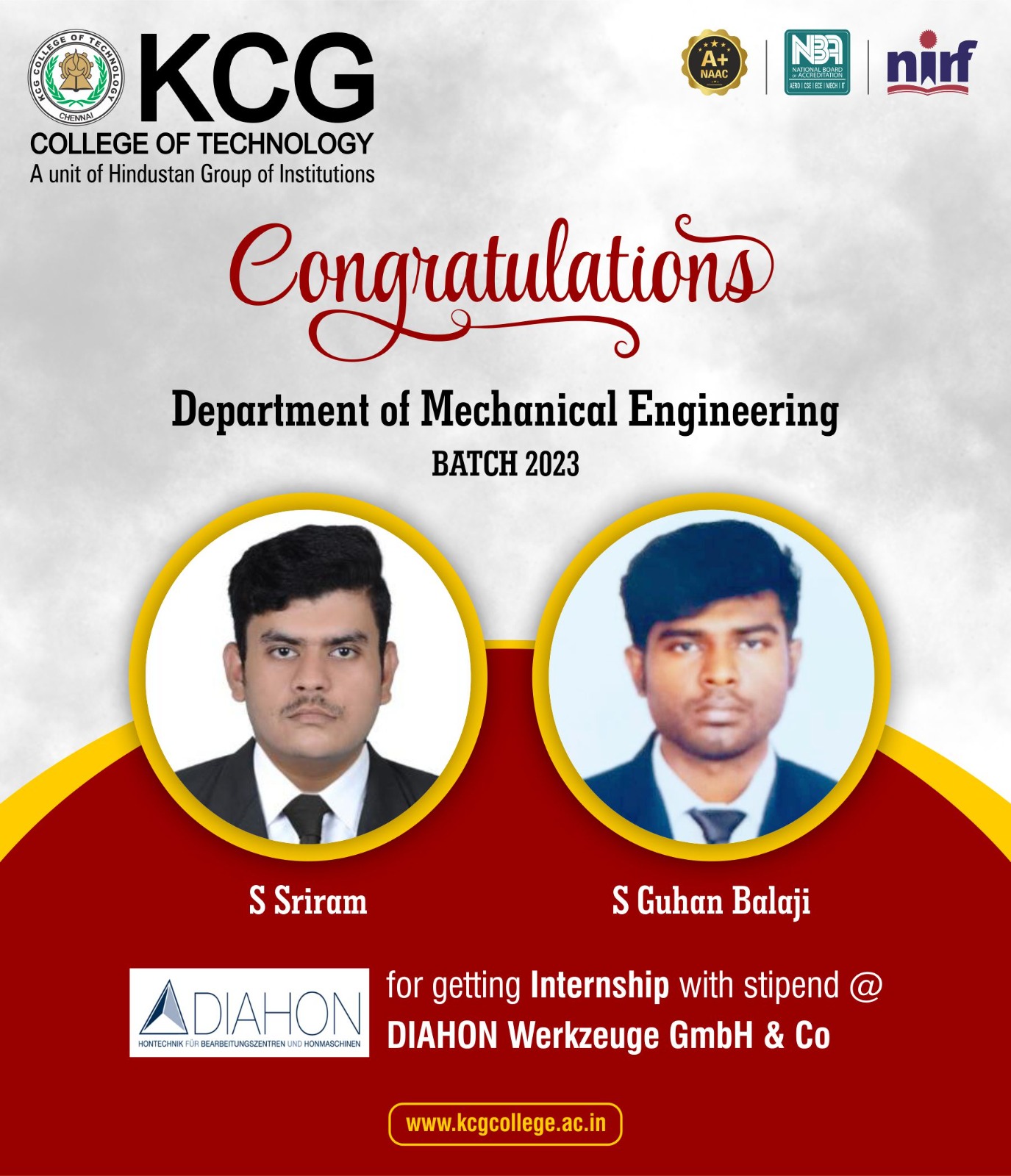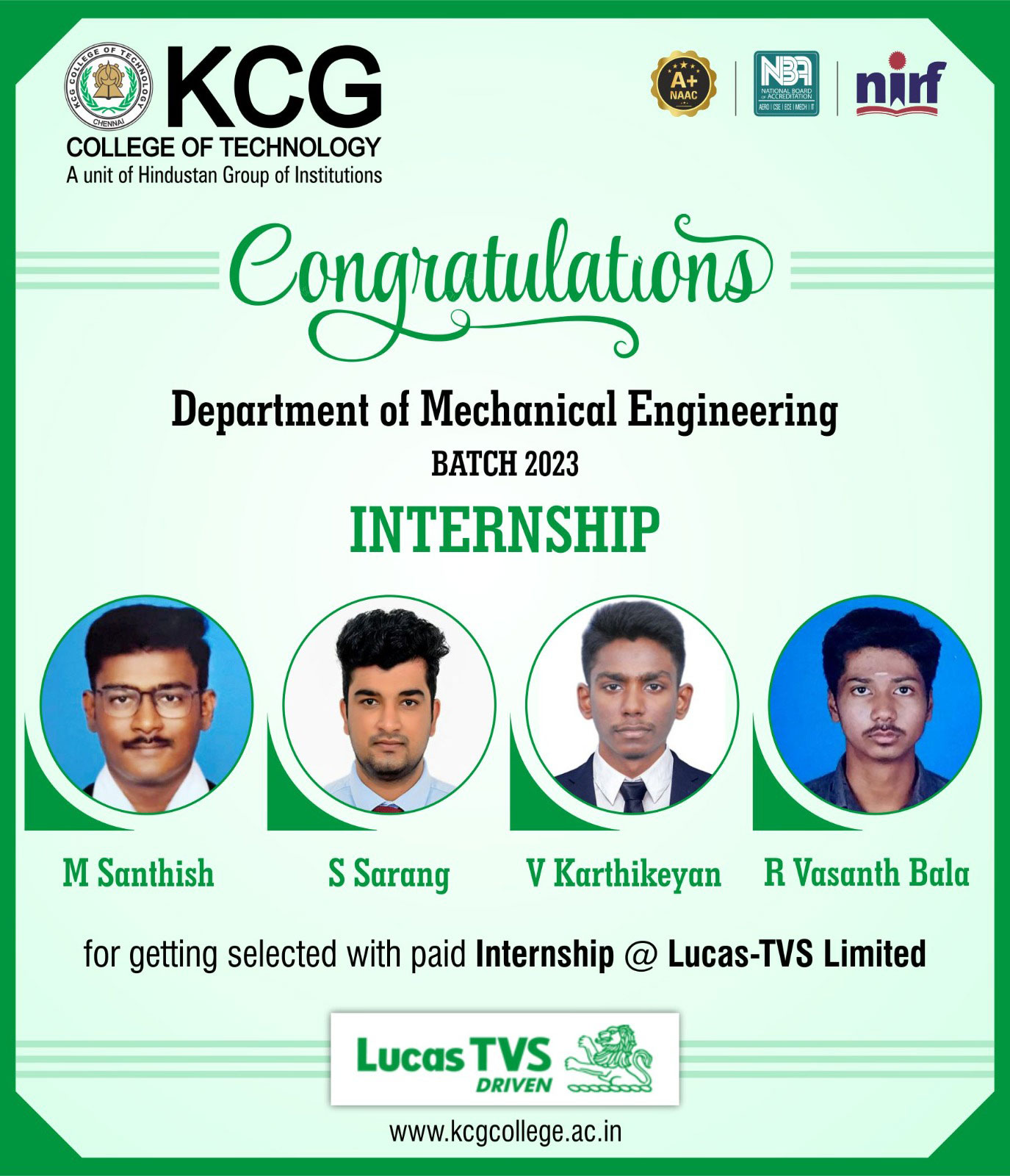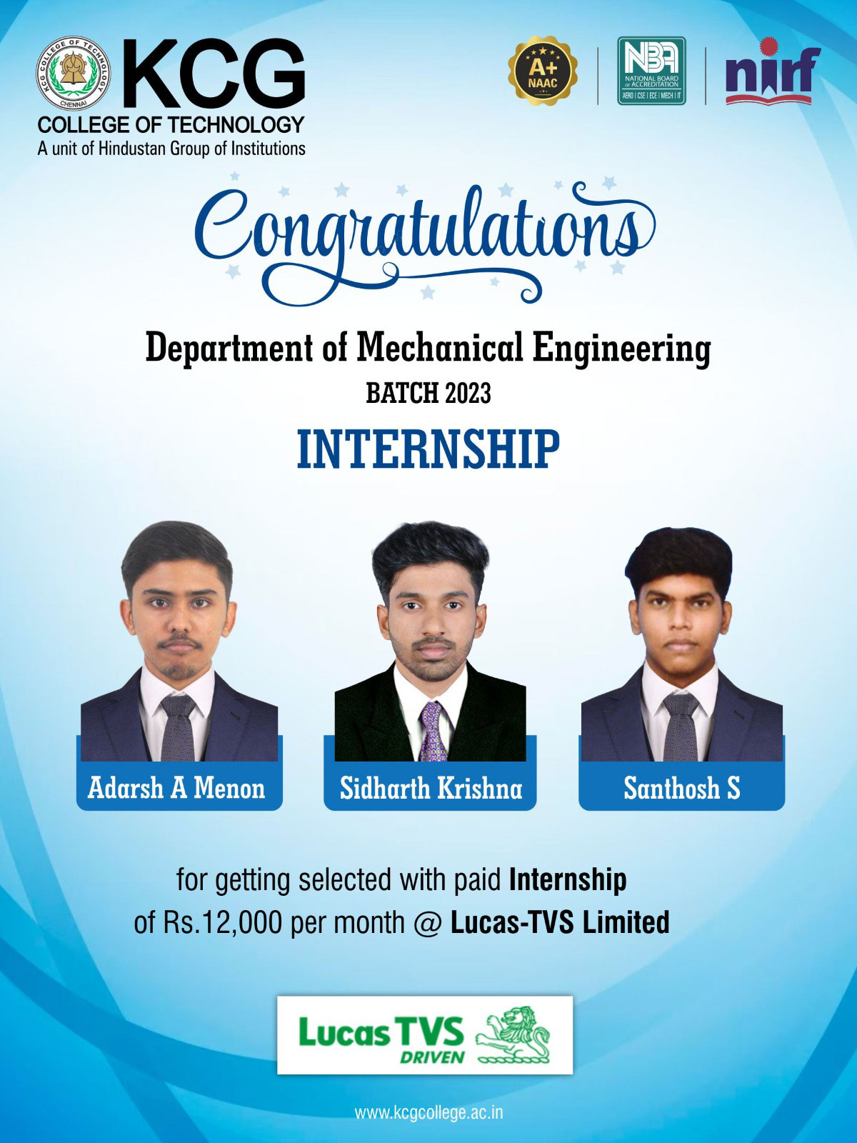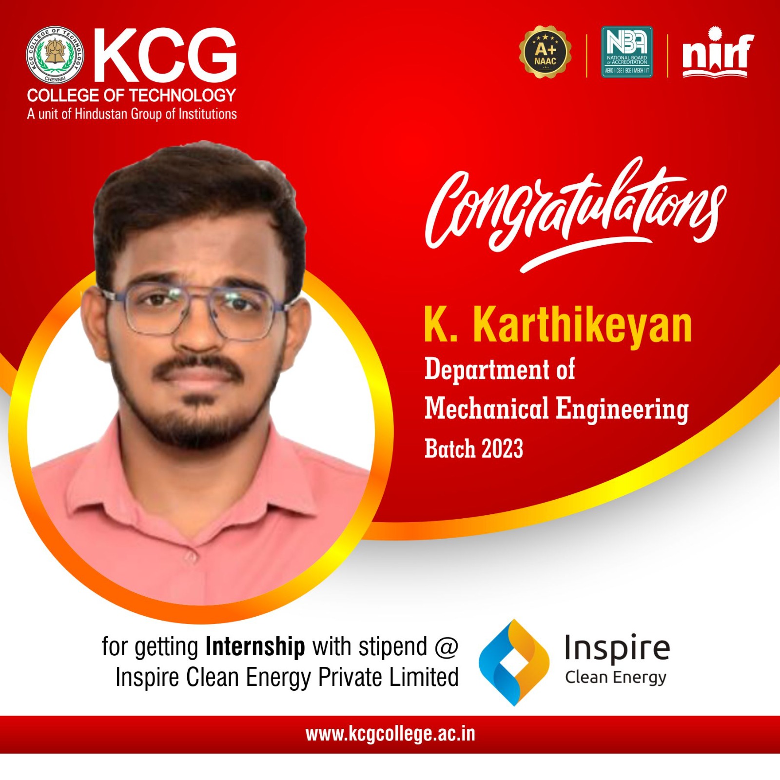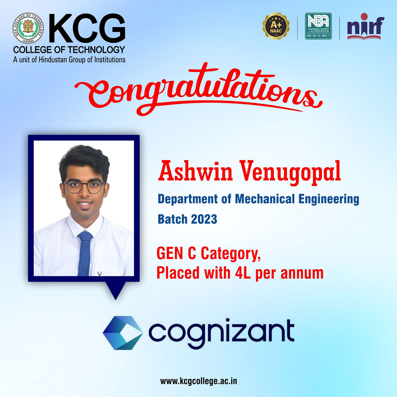 KCG college of technology helped ignite my passion in the field of mechanical and automobile engineering through their constant support for various co-curicular engineering activities such as formula student and many other projects that help bring an engineer out of the textbooks and face real world engineering problems with confidence.”