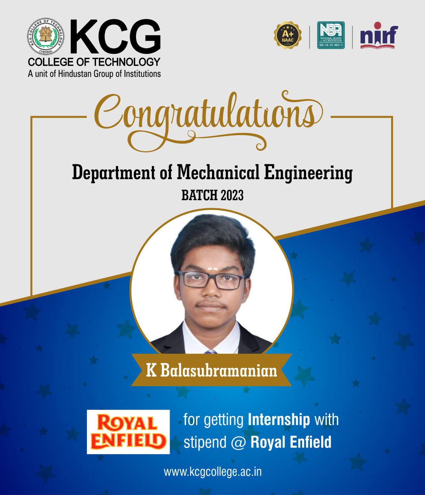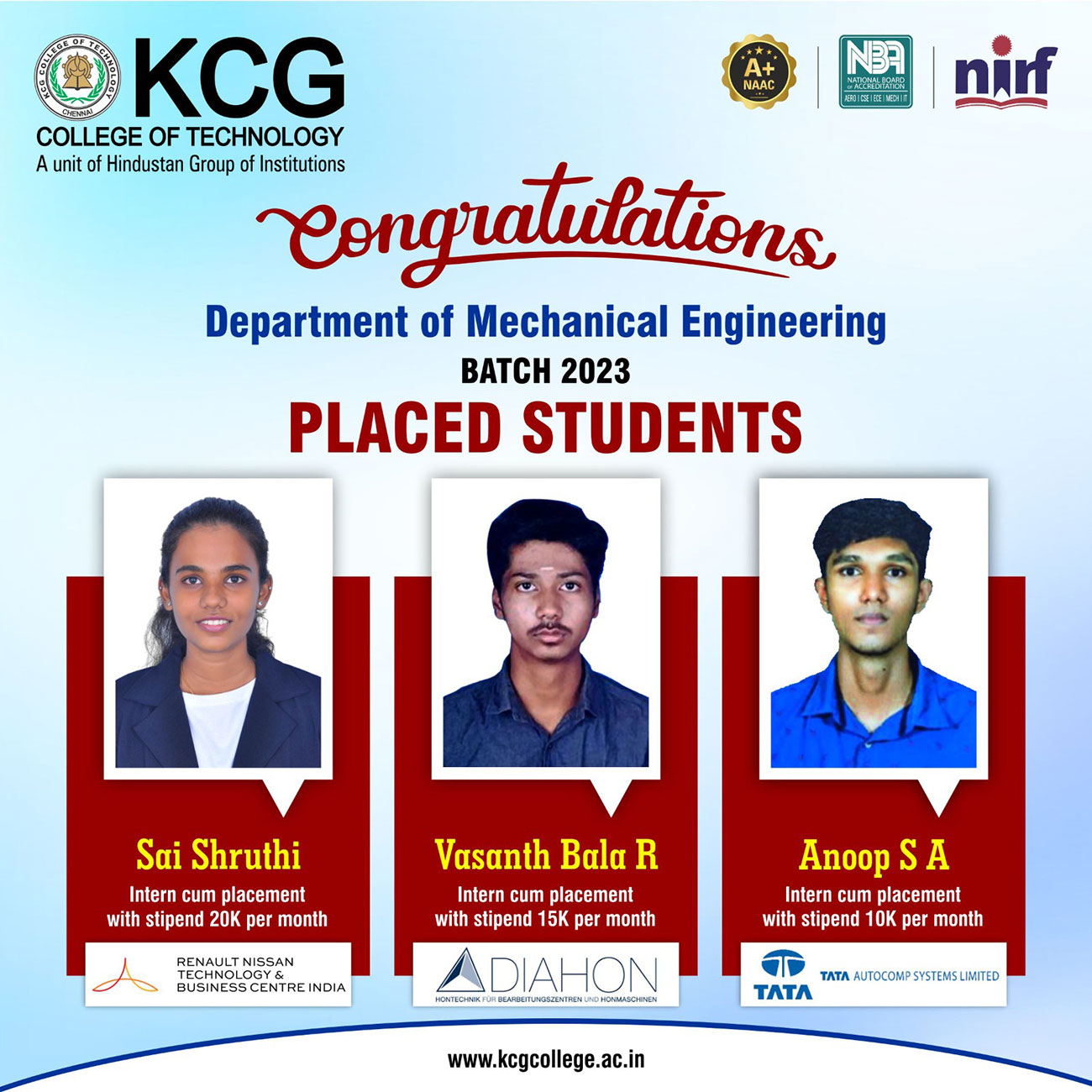 KCG has an excellent student-teacher interaction which brings the best from each and every one of us. They involve us in a lot of individual and industrial projects which will help us learn not only the theoretical part but also the practical one which will help us sustain in the competitive world. With their strong support and guidance, we had manufactured a Formula Student Vehicle which had bagged 5/9 awards of FMAE FFS INDIA 2018. Moreover this knowledge had helped me out to get a job at Halliburton, Singapore as R&D Engineer with a very good salary structure”