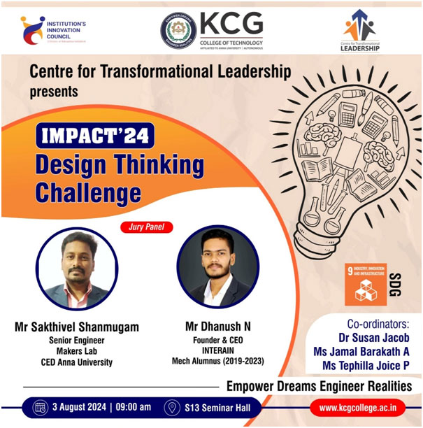 Second Edition of Impact’24 – Design Thinking Challenge was held exclusively for third-year CTL students on August 3, 2024. Mr. Sakthivel Shanmugam, Senior Engineer at Makers Lab, CED Anna University, and Mr. Dhanush N, Founder and CEO of Interain and Mech Alumnus (2019-2023), provided invaluable feedback on the prototype projects presented by the students. A total of 13 teams, comprising 50 students, participated in the challenge. The jury members praised the participants for their efforts. The top three projects were awarded cash prizes and certificates, while the remaining teams received participation certificates.Prize Winners