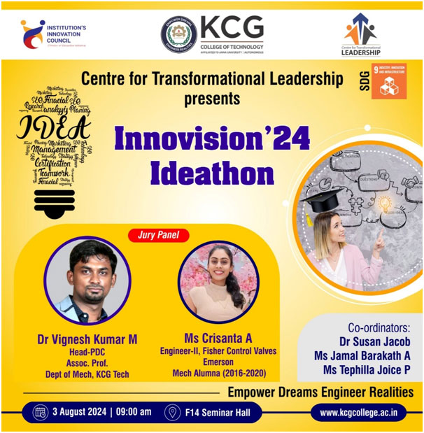 CTL organized the third edition of the Innovision’24 Ideathon Challenge on August 3, 2024, exclusively for second-year CTL students. Fourteen teams, comprising 60 students, participated and presented their ideas to the panel, which included Dr. Vignesh Kumar M, Head of PDC and Associate Professor in the Department of Mechanical Engineering, and Ms. Crisanta A, Engineer II at Fisher Control Values, Emerson, and Mech Alumnus (2016-2020). The jury members provided valuable suggestions to the participants. The top three projects were honored by the jury members.