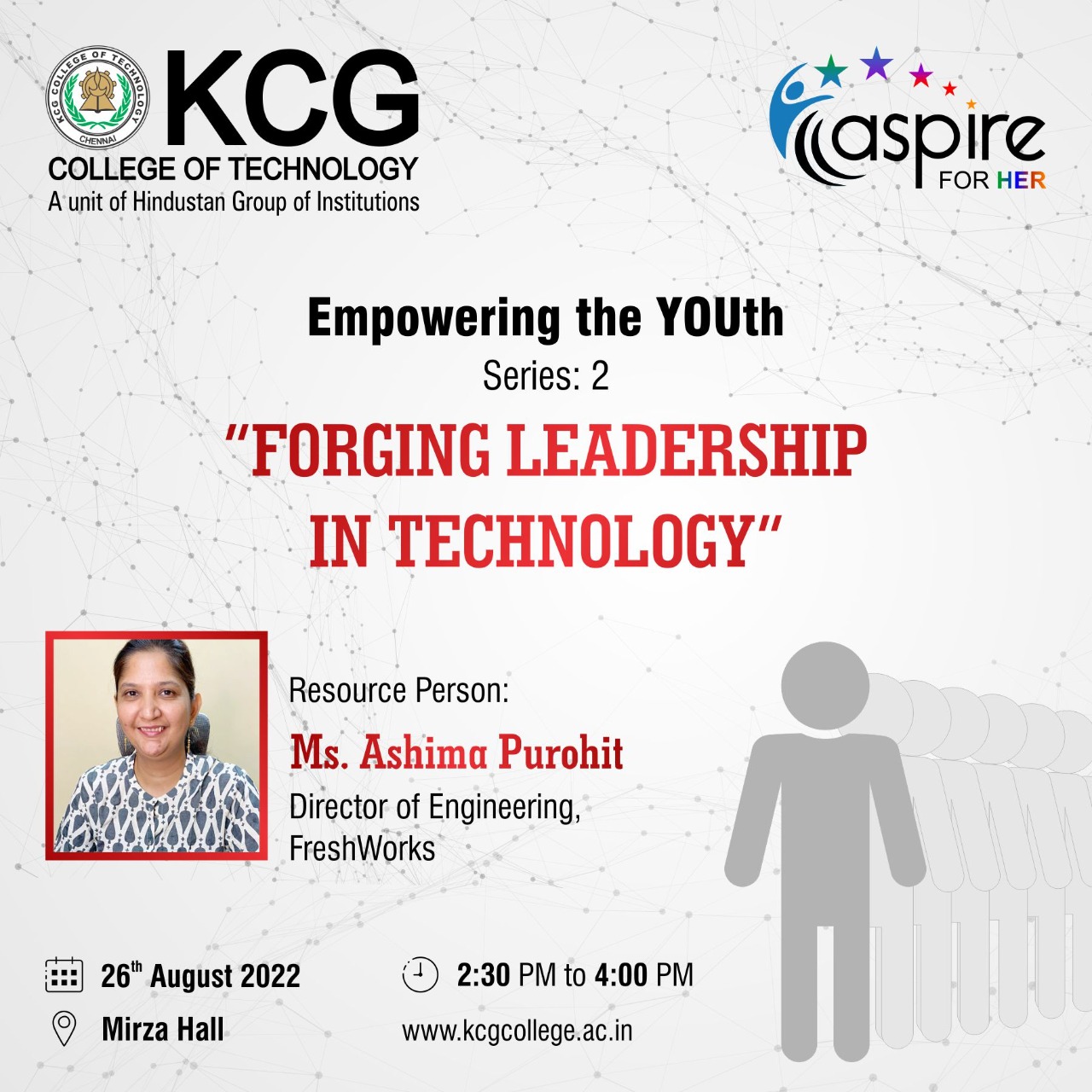 KCG College of Technology in collaboration with Aspire For Her (AFH), conducted a session for our students onthe topic “Forging Leadership in Technology” on 26th August, 2022. Ms Priya Mohan Dass, Networks& Operations Manager, AFH represented the AFH team.