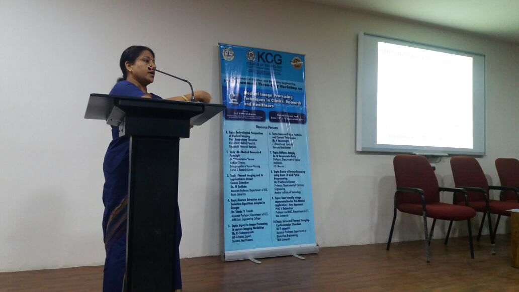 The Department of Electrical and Electronics Engineering, KCG College of Technology organized ICMR sponsored Three Day Workshop on “MEDICAL IMAGE PROCESSING TECHNIQUES IN CLINICAL RESEARCH AND HEALTH CARE” from 14th – 16th September 2017. The inaugural function commenced at 9.30 am in Seminar Hall-I. The meeting was presided over by Dr. G. Prabhakaran, Principal and inaugurated by the Chief Guest, Dr. T. R. Muralidharan, Senior Consultant and Head, Department of Cardiology, Sri Ramachandra University. The meeting formally begun with an invocation and the invited guests were welcomed by Dr. P. Deiva Sundari, Professor & Head, Department of EEE. . Dr. G. Prabhakaran, Principal and Dr. G. Sambandan, Advisor – Electrical Sciences offered felicitations. Around 25 participants registered for the programme. Most of the participants were Faculty from academic Institutions, Research Scholars, PG and UG students. The Chief Guest shared his views in the field of medical image processing and current research methodologies available.