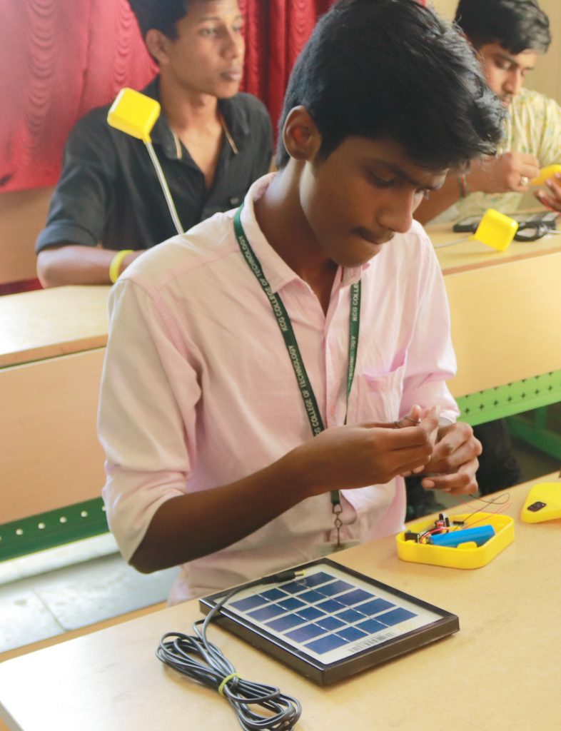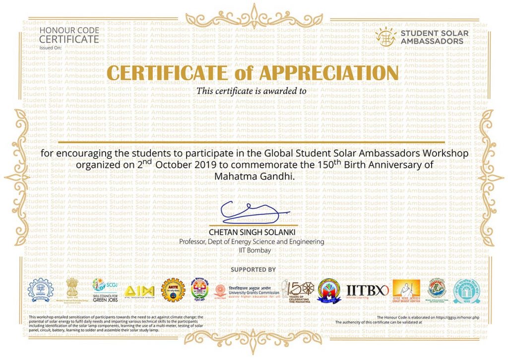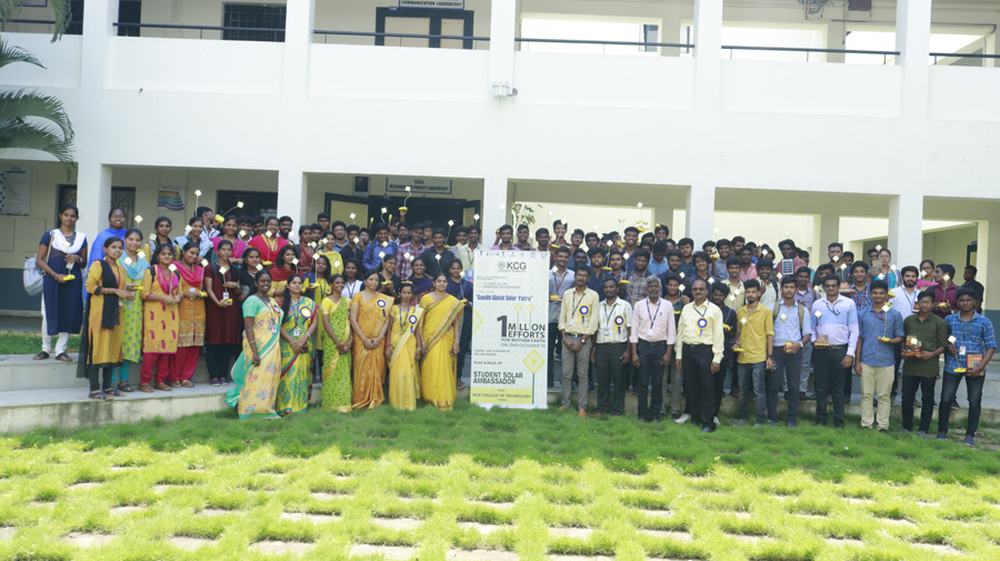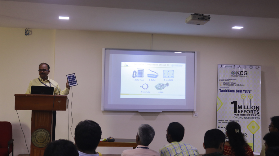 The Department of Electrical and Electronics Engineering of KCG College of Technology in association with IIT Bombay and Ministry of New and Renewable Energy (MNRE) has organized one day hands on Training on “Student Solar Ambassador Workshop-2019” under the scheme Gandhi Global Solar Yatra on 02.10.2019. It is a global event and students from more than 180 countries are participating in this “One day Hands on Training to assemble Solar Study Lamp” in their respective premises. In our college, 100 students from the departments of EEE, EIE and ECE are participating in this workshop. The workshop is aimed to celebrate the Gandhian principles of self-sufficiency and as the International Day of Non-Violence towards Environment. The Solar PV Technology is one of the fast growing renewable energy which does not harm the environment. As a green campus, KCG College of Technology continuously providing its support for nation to create awareness among the youngsters and guiding them to utilize the renewable energy sources.