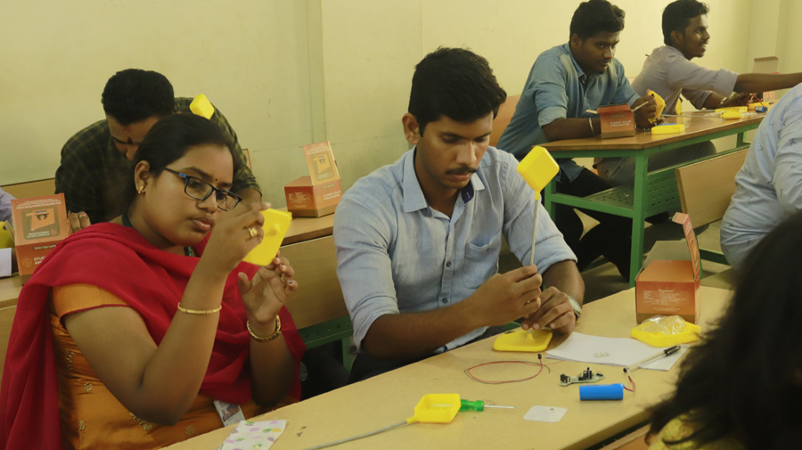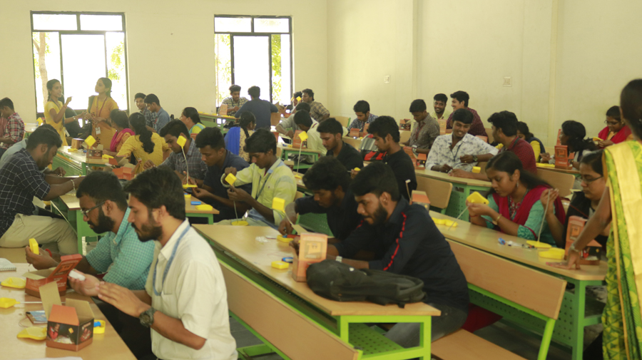After the post lunch, session 3 started (2.00am to 4.30pm) during which step by step assembly of solar lamp was done by the students. The trainers Mr.S.Balaji, Ms.M. Ramya, Mr.V. Subramaniyan, Dr.S.Prabhuraj, Ms. R. Gayatri, Ms.M. Shanmugapriya and Ms.S. Manisha from department of EEE guided the students for assembling their study lamp.