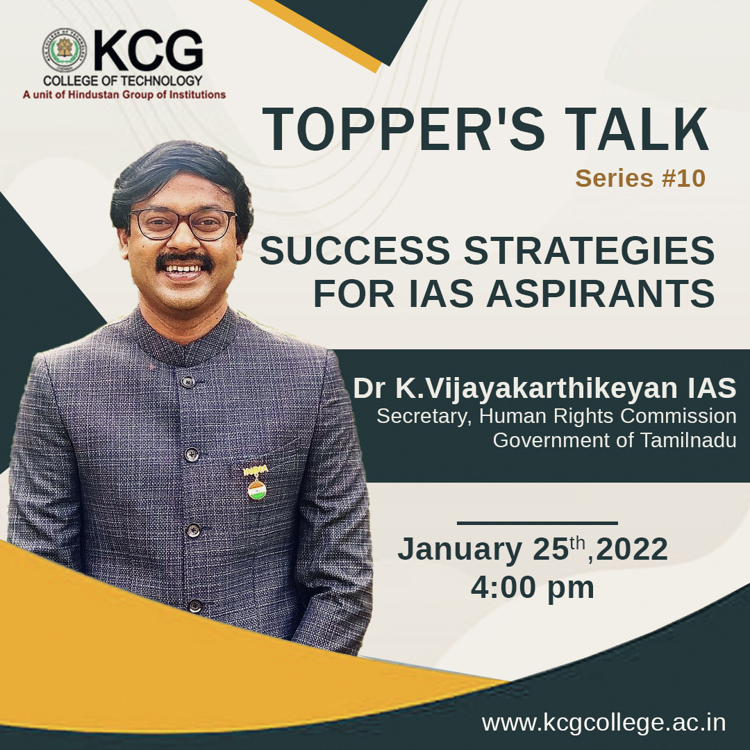 Calendar When: January 25, 2022 @ 4:00 pm – 5:30 pm 2022-01-25T16:00:00-01:00 2022-01-25T17:30:00-01:00 Topper’s Talk Series# 10 Speaker : Dr. K.Vijayakarthikeyan I.A.S., Secretary , Human rights Commission, Government of Tamilnadu Click here for Invitation
