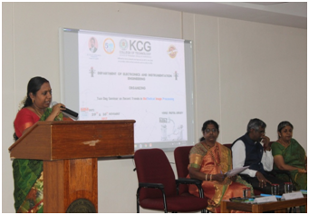 The Department of EIE, KCG College of Technology Conducted Two Days Seminar on “Recent Trends in Biomedical Image Processing” on 29th and 30th November 2017. The Programme started with Inauguration on November 29th 2017. Dr.N.Bharathi , Head of the Department (EIE) and Convener of the Seminar gave the Welcome address. Dr.G.Prabhakaran, Principal, and Dr. Sumathi Poobal, Vice Principal, KCG College of Technology gave felicitation address. Dr.A.K.Jayanthy, Professor-Department of Biomedical Engineering, Kattankulathur Campus, SRM University inaugurated the session and gave inaugural talk. The inaugural session came to an end with the vote of thanks by Ms.Sunetra Banerjee.