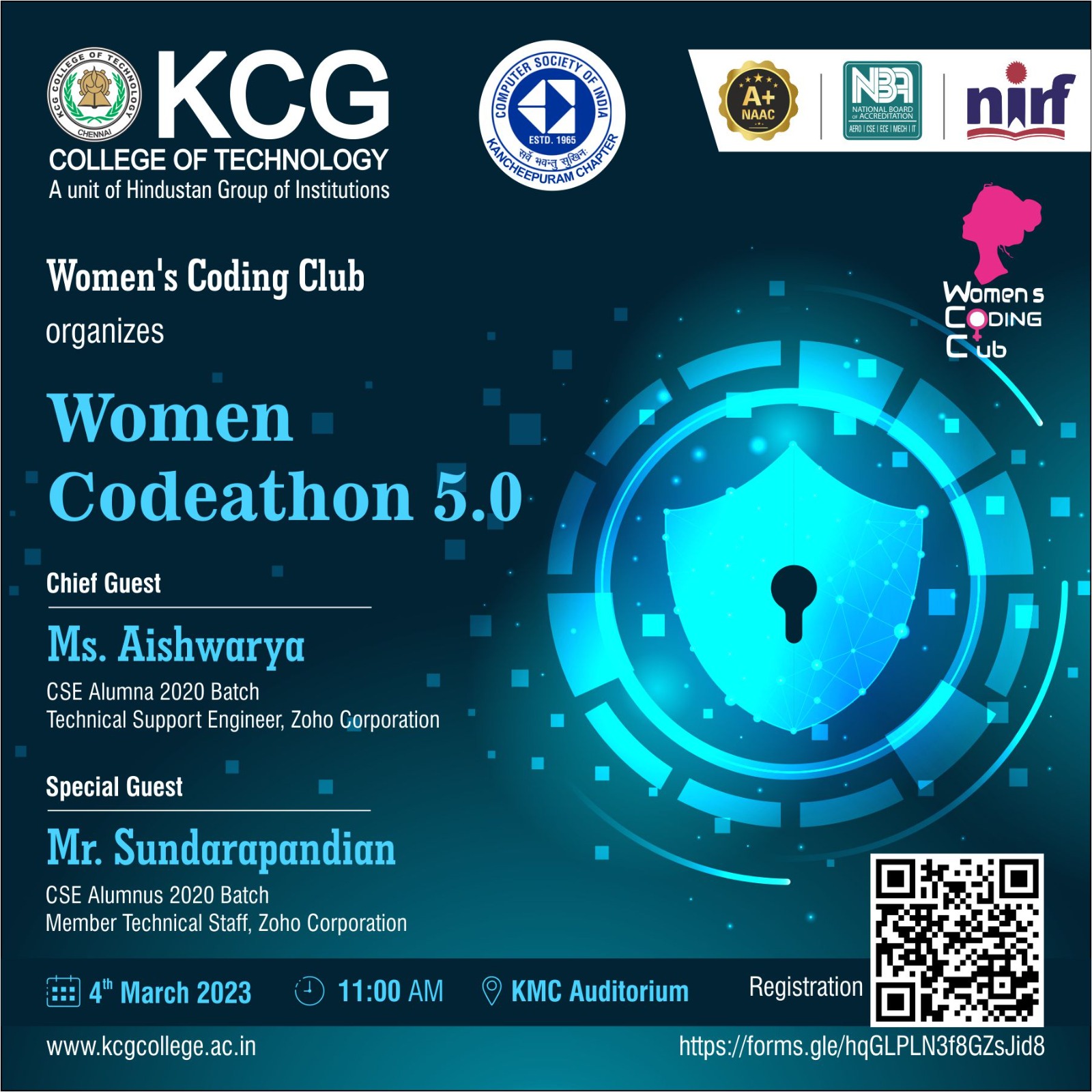 KCG Women’s Coding Club has organized a Hackathon- Women Codeathon 5.O for girl students on 4.3.22 (Saturday). The event started with a formal inauguration by Ms. Anju A, KCG Women’s Club Coordinator. The contest started at 11.00 am, the girl students from various department had registered and participated in the event. Around 60 students had registered and 20 teams (50 students) had participated for the Hackathon-. Students were asked to solve different problem statements in different domains. Students were asked to do a presentation and to show working application of their idea. The invited panel members Ms Aishwarya and Mr Sundarapandian (CSE 2020 alumni) from Zoho corporation evaluated the teams for creativity, novelty and presentation of their idea. Judges appreciated the students involvement and creativity and asked them to extend their imagination to next level. Students had shared their experiences about the Codeathon, they were very enthusiastic and excited to solve each challenge. The event ended at 3.15 PM with vote of thanks.