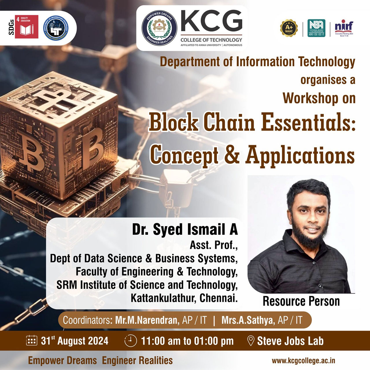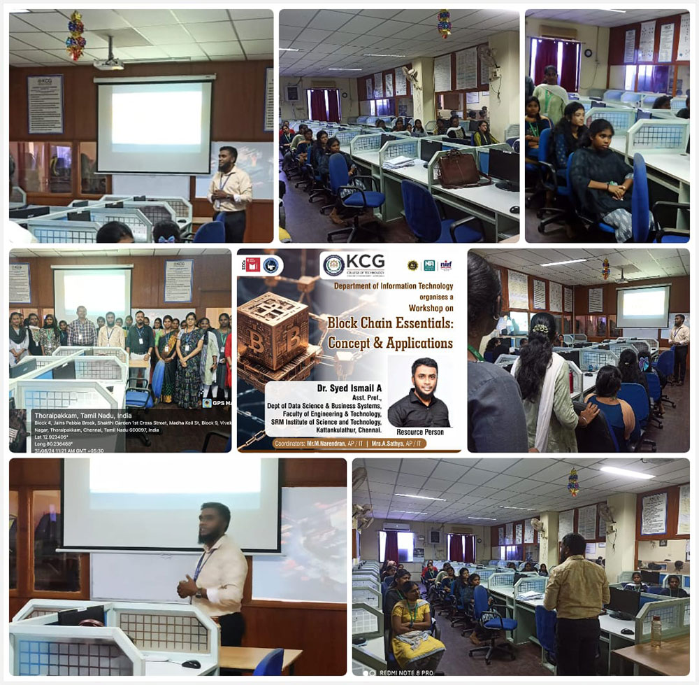 One day Hands-On Workshop on “Unlocking Innovation with Blockchain Technology – Fundamentals and Applications” is conducted mainly to bridge the gap between theoretical knowledge and real-world application, providing participants with the tools and skills needed to leverage Block Chain effectively in their respective domains. Speaker: Dr.Syed Ismail A, Assistant Professor, Department of Data Science and Business Systems, Faculty of Engineering & Technology, SRM Institute of Science and Technology, Kattankulathur, Chennai.