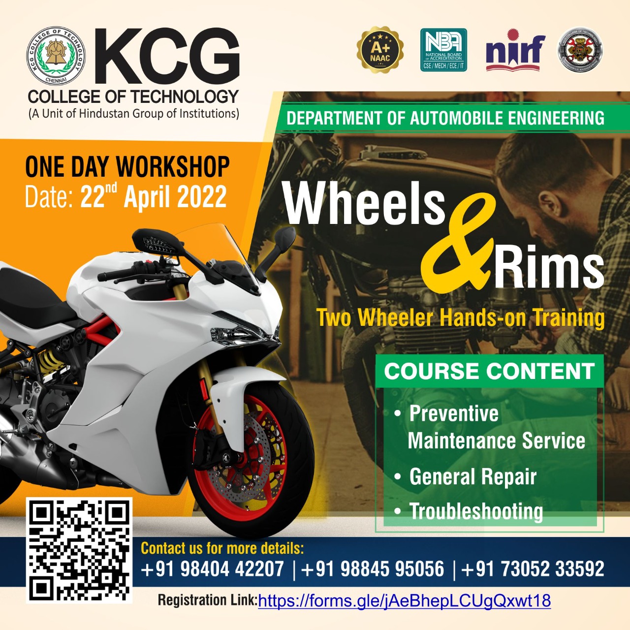 The Hands-on training for 2-wheelers hosted by Department of Automobile Engineering, KCG College of Technology Karapakkam, Chennai, was held on 22nd April 2022 (Friday). Every aspect of the event, from its inception to the execution had been the outcome of the culminated efforts of the faculty and students of the department. The registrations were closed on 21st April, 2022 with effect to the same duration of which an overwhelming response had been observed from participants belonging to over 23 students of various colleges.