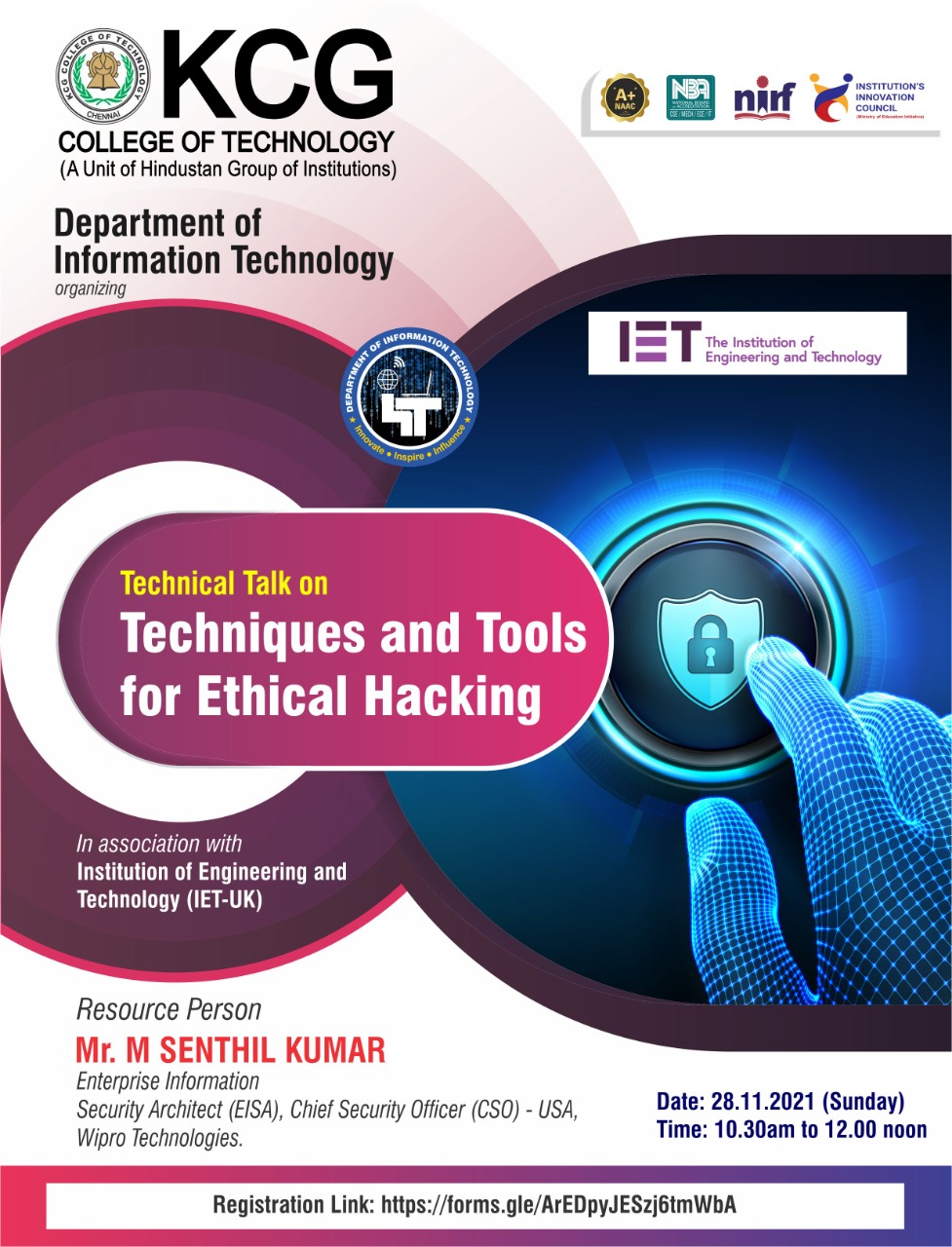 IT Department had planned for a technical talk on the title “Techniques and Tools for Ethical Hacking” on 28th November 2021 from 10.30 am to 12.00 Noon.