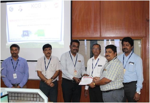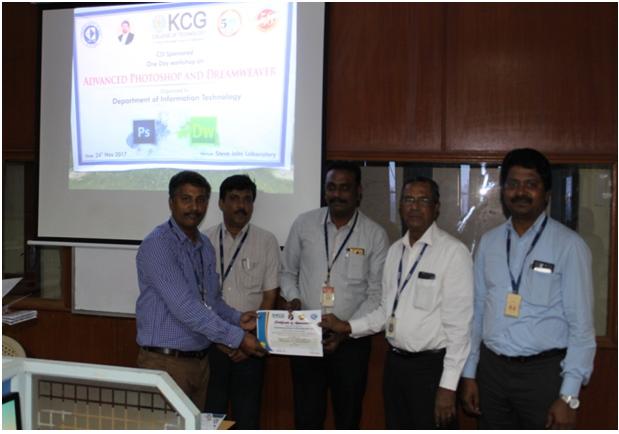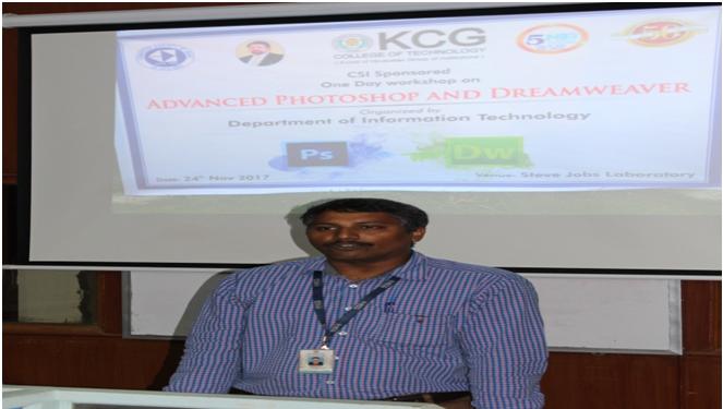 The program started with the inaugural function at 9.00 A.M . Dr. Sumathi Poobal, Vice Principal, KCG College of Technology was the chief guest. She appreciated the Department for organizing such a workshop, which was indeed the need of the hour. The Head of Department, Dr. J. Frank Vijay underscored on the importance of such a programme and suggested that the idea for such a workshop came from the dependency the faculty members are showing on the students even for simplest editing jobs like designing brochures and other related items for departmental programmes and activities. He insisted the resource person to conduct the workshop in such a way where hands on experience is imparted, and inevitably after the completion of the workshop, all the faculty members who have attended the programme should be able to design a brochure by themselves.